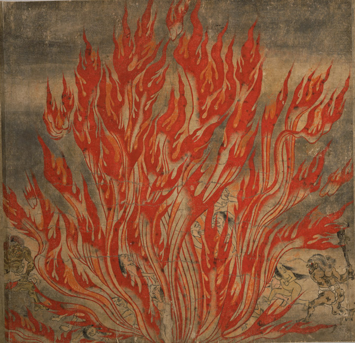 - 나라 국립 박물관 소장의 『벽사도(辟邪絵)』(헤키자에)는, 죄인이 아닌 귀신이 고통을 받는 에마키(絵巻)로 12세기 후반의 작품이다. 쇼키(鍾馗)나 우두천왕, 비사문천 등의 신들이 귀신을 벌하는 것으로, 거기에는 중국에서의 악마 쫓는 신앙의 영향이 있다. 한때는 그 무서운 묘사가 지옥을 그린 에마키(絵巻)라고 오랫동안 생각되어 왔다[73]。