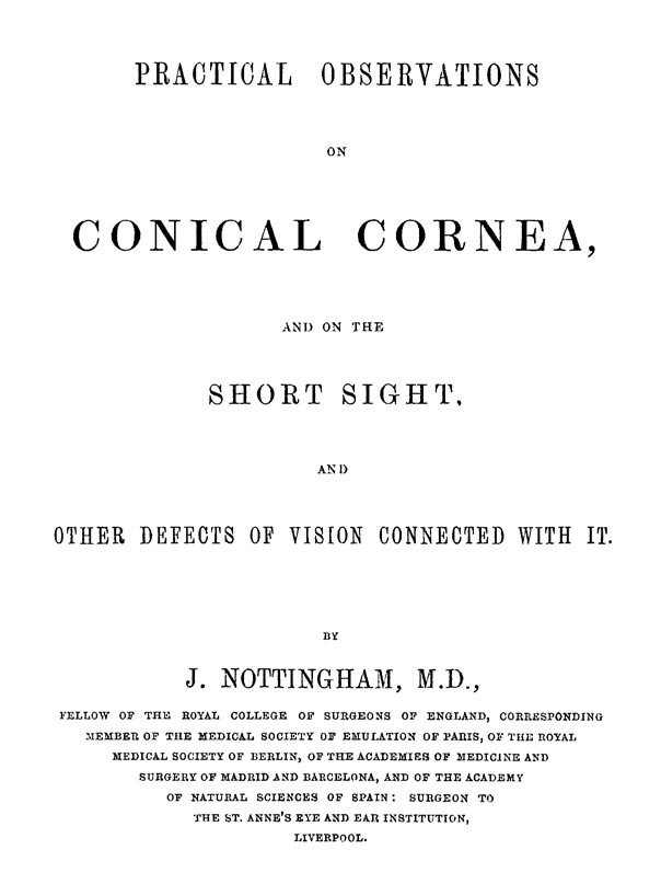 1854년 노팅엄의 획기적인 원추각막 관련 텍스트 ''원추각막에 대한 실질적인 관찰''