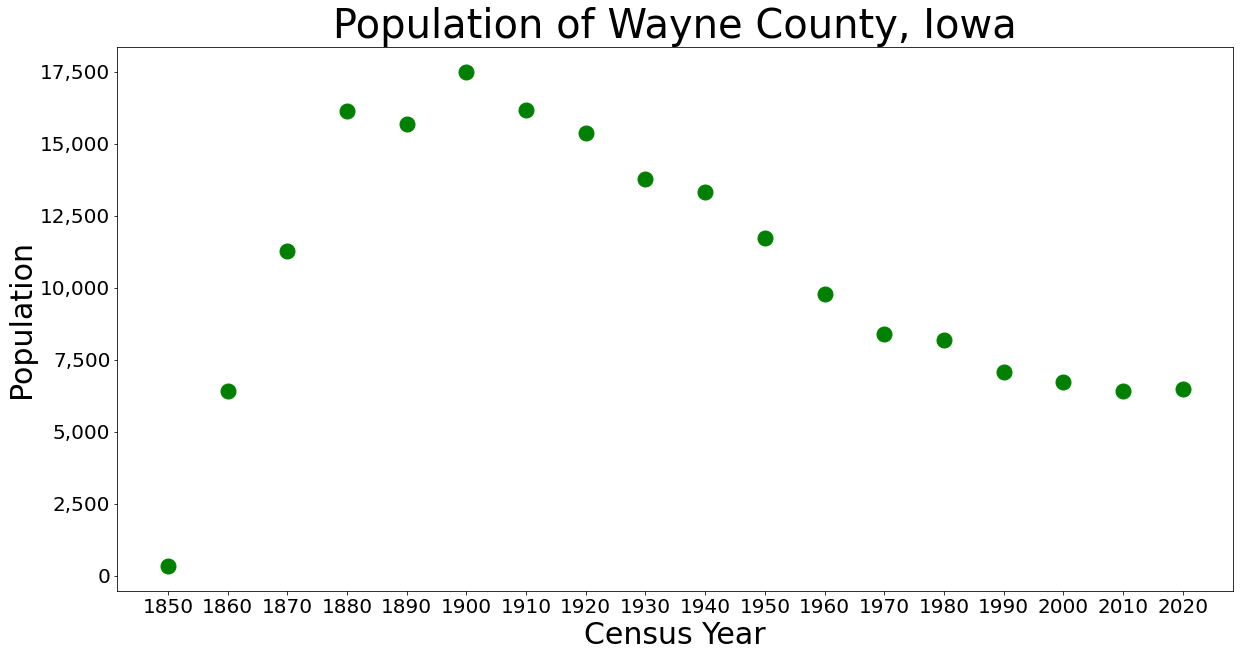 웨인군의 인구는 1850년 340명에서 지속적으로 증가하여 1900년 17,491명으로 정점을 찍었다.[7][8] 이후 인구가 감소하여 1970년에는 8,405명,[7][27] 2010년에는 6,403명,[31] 2020년에는 6,497명을 기록했다.[6] 2023년 추정치는 6,557명이다.[6]연도 | 인구 |