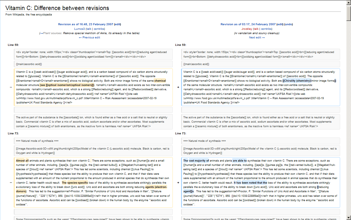 대부분의 위키에서는 업데이트 로그에서 "'''개정 내역'''"과 "'''차이'''" 기능을 이용할 수 있다. "'''개정 내역'''"은 해당 페이지의 이전 버전을 볼 수 있게 해주며, "'''차이'''" 기능은 두 버전의 차이점을 강조 표시해 준다. 위키 사용자는 차이 기능을 통해 허용할 수 없는 편집이 있을 경우 이전 버전으로 되돌릴지 판단할 수 있다.[27]