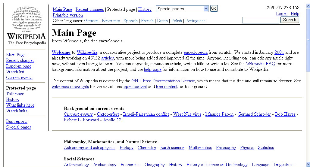 2003년 | 영어 위키백과 10만 문서, 독일어 위키백과 1만 문서 돌파,[67][68][69][70][71][72][73][74][75] 위키미디어 재단 설립, 직소 퍼즐 로고 채택, TeX 수학 공식 도입, 첫 위키백과 모임, 중재 시스템 개발, 위키문헌 시작 |