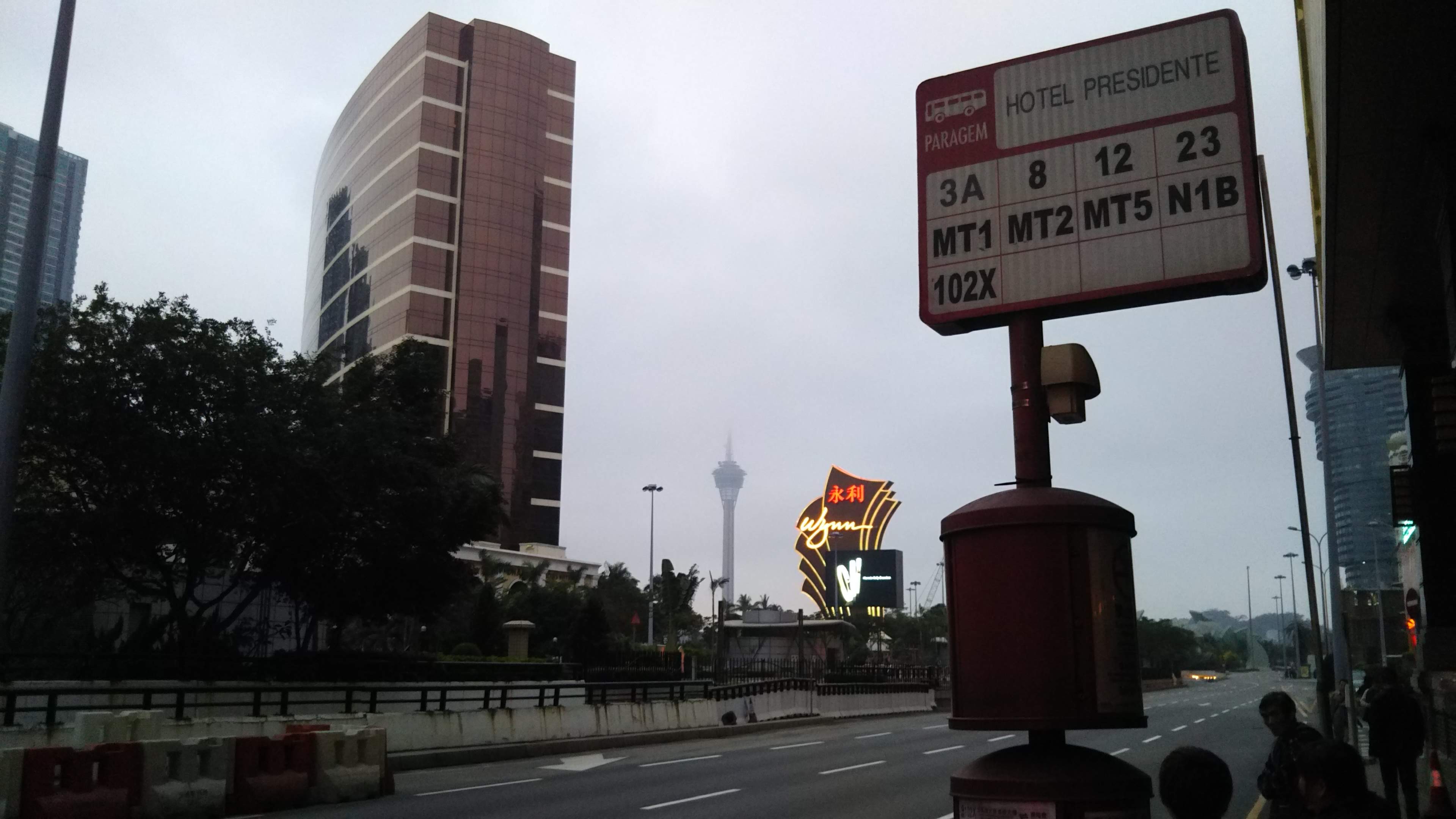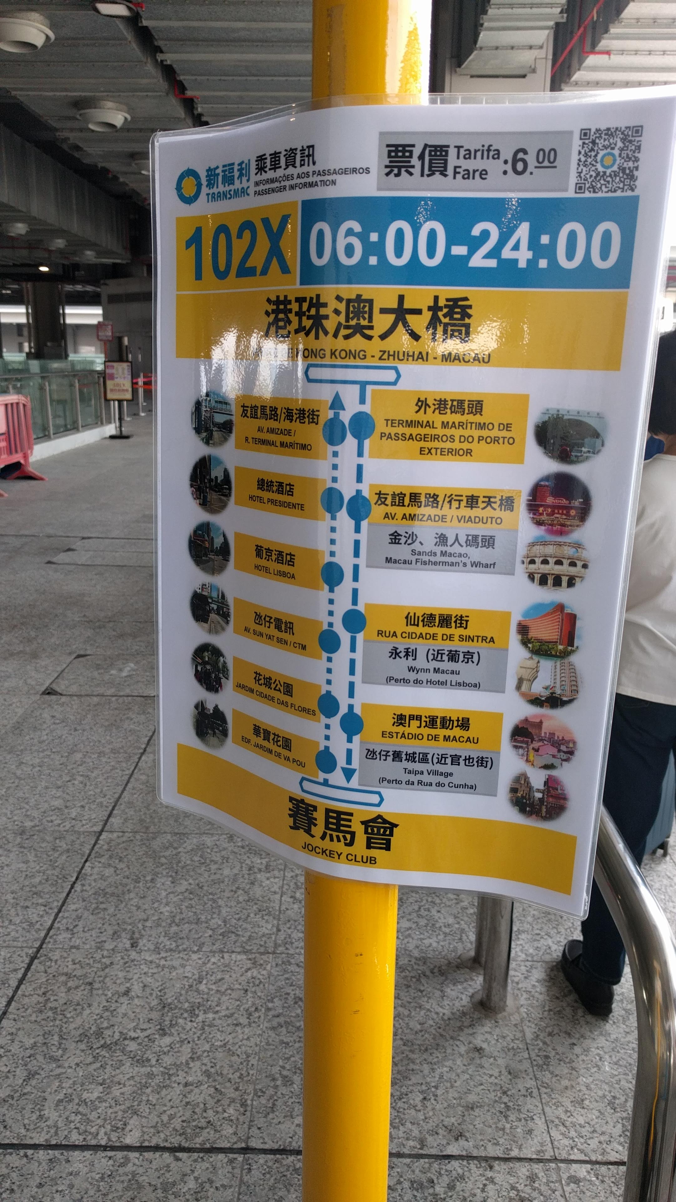 2019년 시점에서 홍콩-마카오 간 육로교(항주아오대교(港珠澳大橋))에서는 셔틀버스가 운행되지 않아, 택시 또는 일반 버스를 이용해야 한다.[1] 102X번 버스를 이용하여 "프레지던트 호텔 앞"에 하차하면 편리하다.[1] 심야편으로 일본에서 홍콩 국제공항을 경유하여 방문하는 경우에는 버스 운행 서비스가 제한적이어서 심야에도 운행하는 101X 노선을 이용하게 된다.[1]