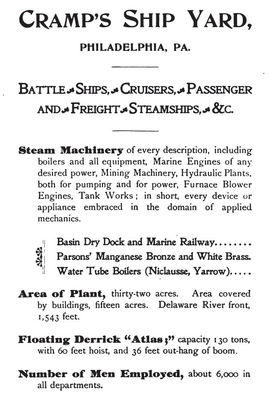 1890년대에는 전함 USS ''인디애나''와 USS ''매사추세츠'', 장갑 순양함 USS ''뉴욕'', 방호 순양함 USS ''콜롬비아'' 등 미국 해군을 위한 주요 함선을 건조했다.[4] 이 중 세 척은 1898년 산티아고 데 쿠바 해전에서 스페인 함대를 격파하여 미국이 강대국으로 부상하는 데 기여했다.[4]