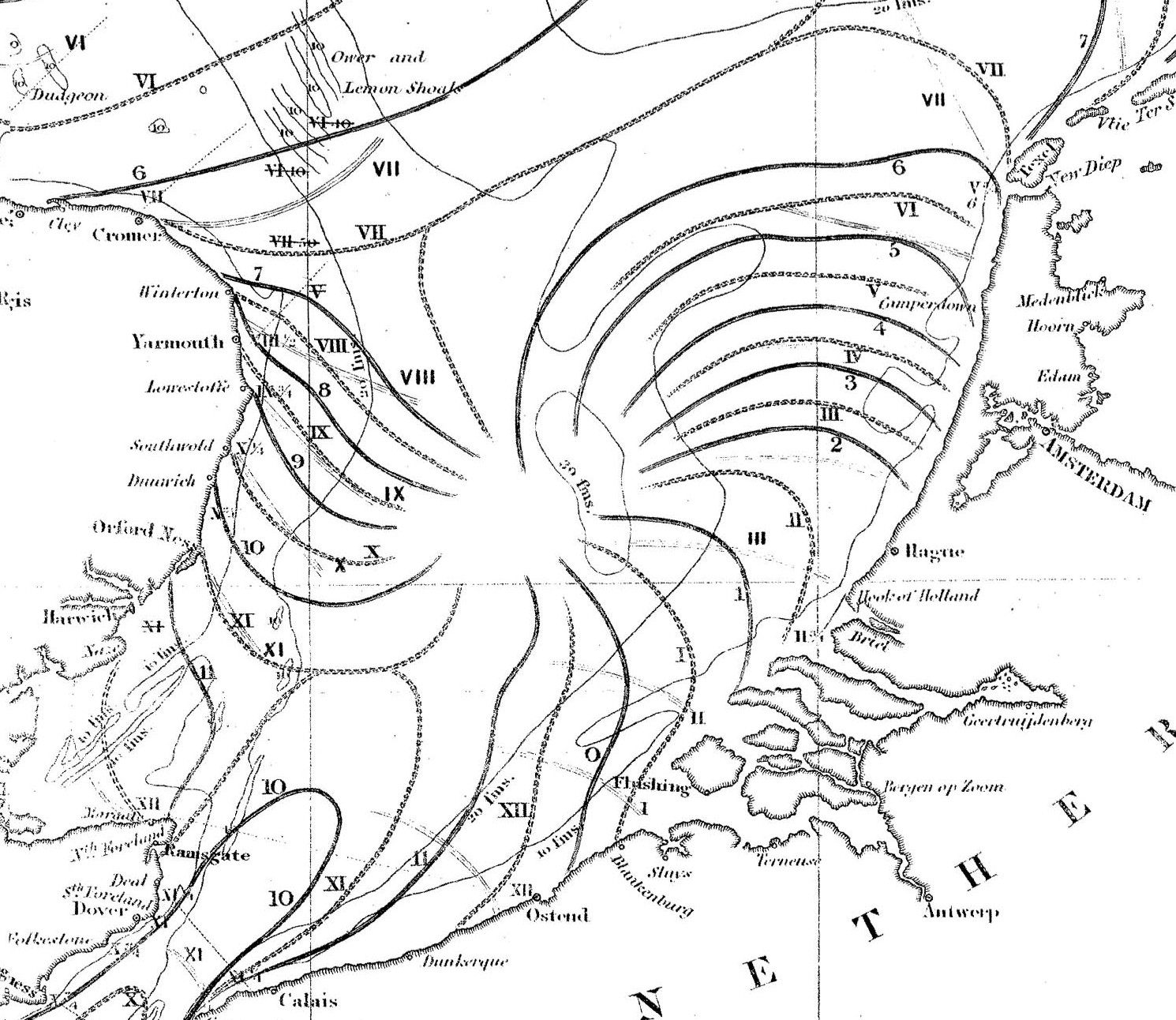 휴얼은 그래픽 방법을 광범위하게 사용했으며, 이러한 방법은 결과를 표시하는 방법일 뿐만 아니라 데이터 분석 도구가 되었다. 그는 등조선(러벅이 만든 용어)을 보여주는 여러 지도를 발표했는데, 등조선은 만조가 동시에 발생하는 지점을 연결하는 선이다. 이를 통해 바다를 통한 조석의 진행 상황을 그래픽으로 나타낼 수 있었다. 이를 통해 휴얼은 북해 남부에 조석의 상승이나 하강이 없는 곳이 있어야 한다고 예측했다.[21] 이러한 "무조석 지대"는 현재 팽대점이라고 한다. 1840년, 해군 측량사 윌리엄 휴엣은 휴얼의 예측을 확인했다. 여기에는 그의 배인 HMS ''페어리''를 정박하고 동일한 위치에서 반복적으로 수심을 측정하는 것이 포함되었으며, 해저의 불규칙성과 조류의 영향을 고려하기 위한 예방 조치가 필요했다. 데이터는 약 0.30m 이하의 상승을 보여주었다.[22][23]