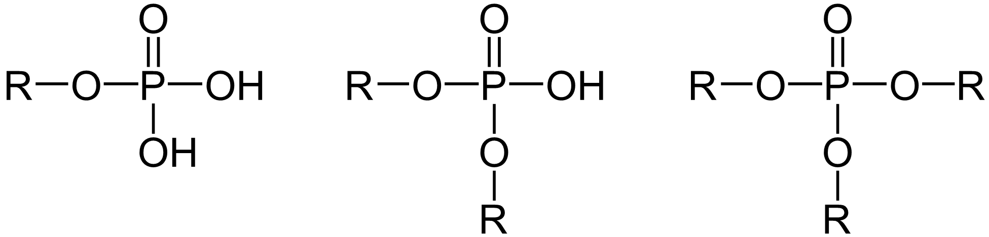 유기 인산염은 여러 겹치는 작용기를 포함하는 화합물 부류이다. 이들은 주로 인산의 에스터이며, 결합된 유기 화합물 그룹의 수(아래 이미지에서 'R'로 표시)에 따라 모노에스터, 디에스터, 트리에스터로 구분된다. 일반적으로 인공 유기 인산염은 대부분 트리에스터인 반면, 생물학적 유기 인산염은 대개 모노에스터 또는 디에스터이다. 트리에스터의 가수분해는 디에스터와 모노에스터를 형성할 수 있다.[6]