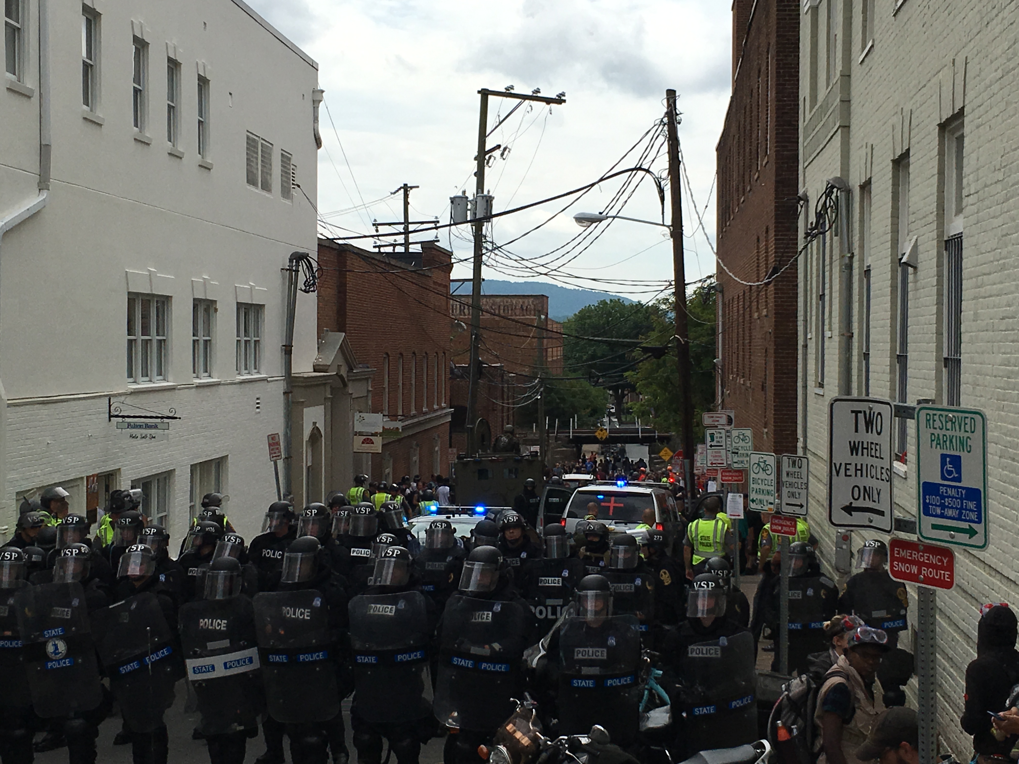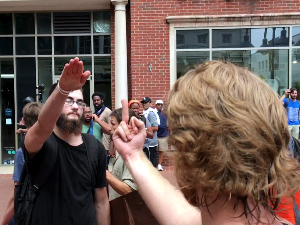 8월 11일 저녁, 백인 민족주의자들은 버지니아 대학교 캠퍼스에서 횃불을 들고 행진하며 "백인의 생명도 소중하다", "너희는 우리를 대체할 수 없다", "유대인은 우리를 대체할 수 없다", "피와 토양" 등의 구호를 외쳤다.[497] 이들은 로툰다에서 반대 시위대와 마주쳐 난투극이 벌어졌다. 양측에서 여러 명이 최루 스프레이를 맞았고, 경미한 부상을 입었다. 버지니아주 경찰이 싸움을 중단시키기 위해 도착했다.[497]