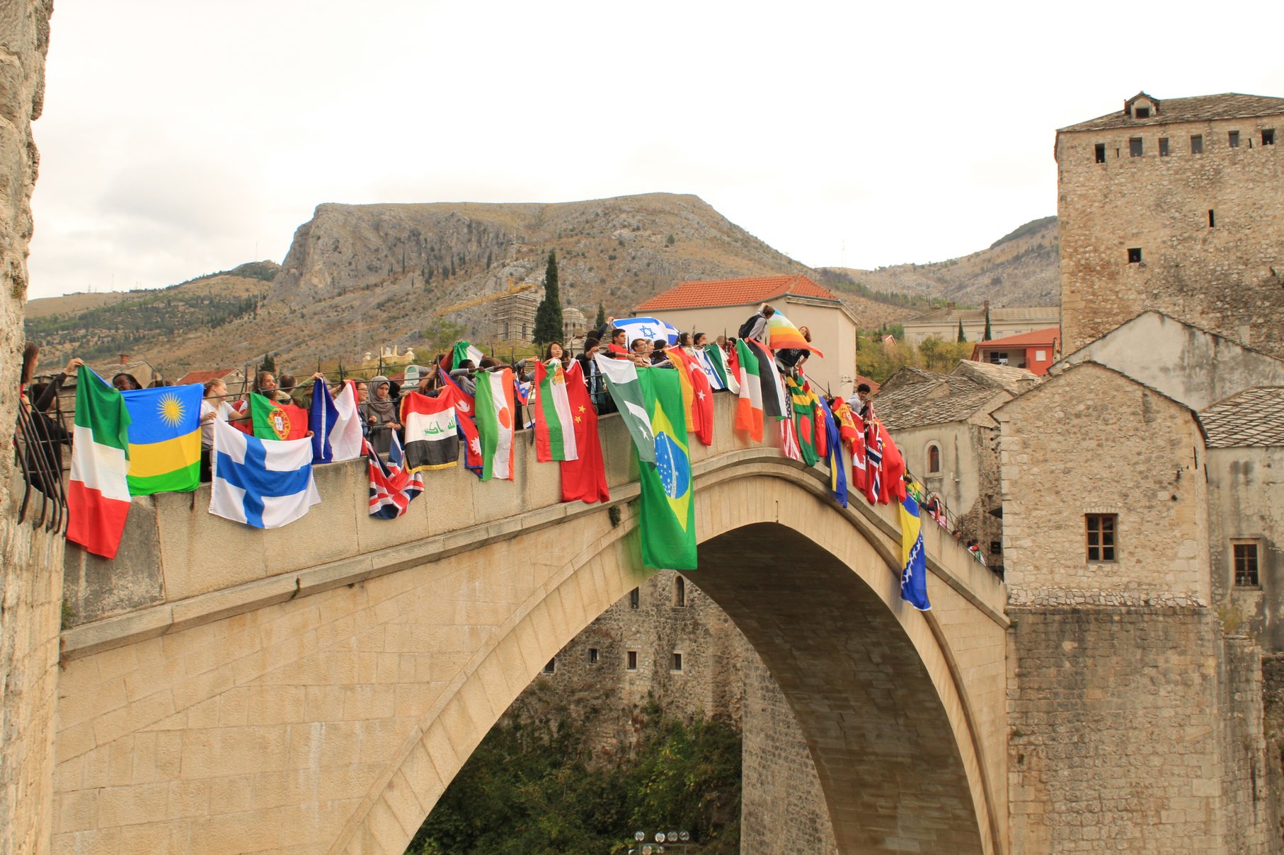 2018년 10월 7일, UWC 모스타르 학생들이 스타리 모스트 다리에서 자국 국기를 흔들고 있다.