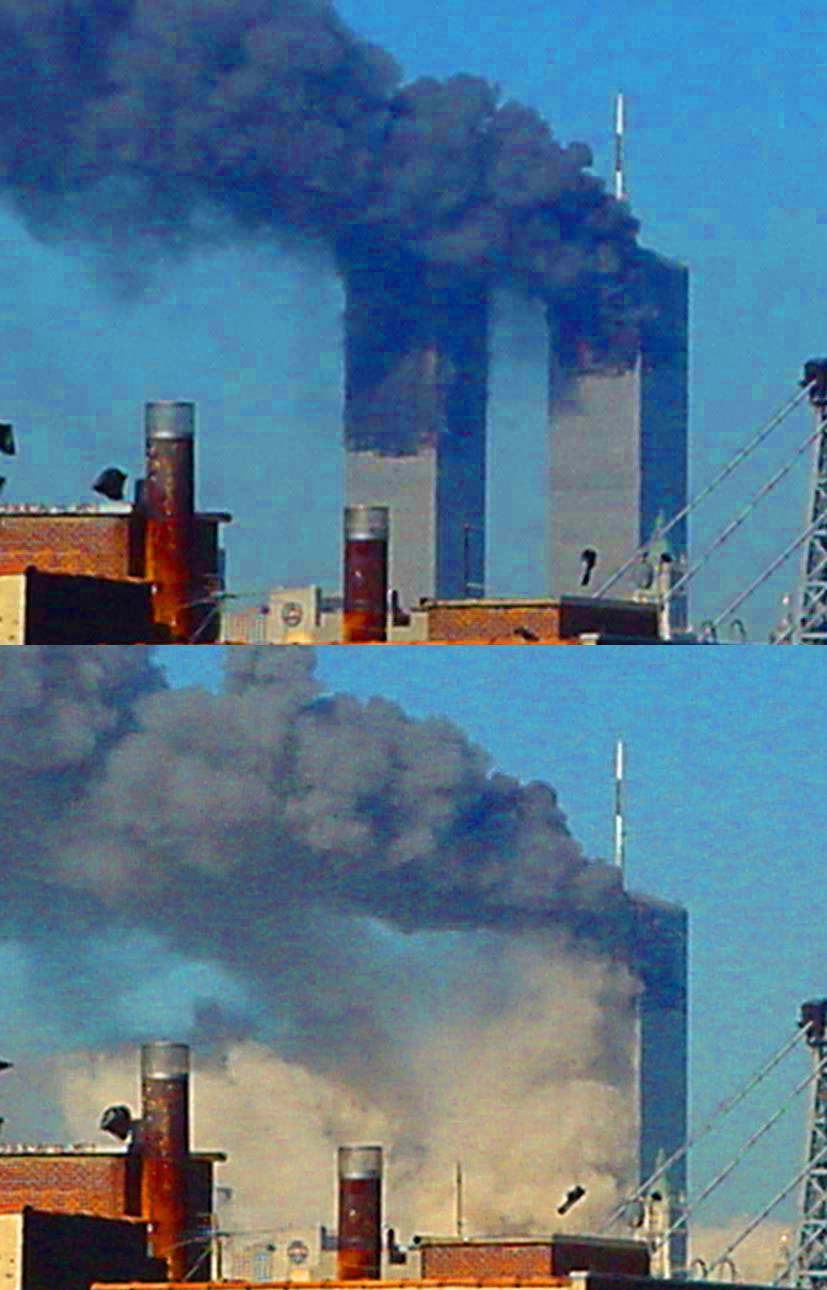 남쪽 타워는 175편이 충돌한 후 56분 동안 화재에 휩싸이다 9시 59분에 붕괴되었다.[109][108] 붕괴는 175편의 충돌로 인한 구조적 손상과 제트 연료 화재로 인한 철골 구조의 약화가 복합적으로 작용한 결과였다.[31]