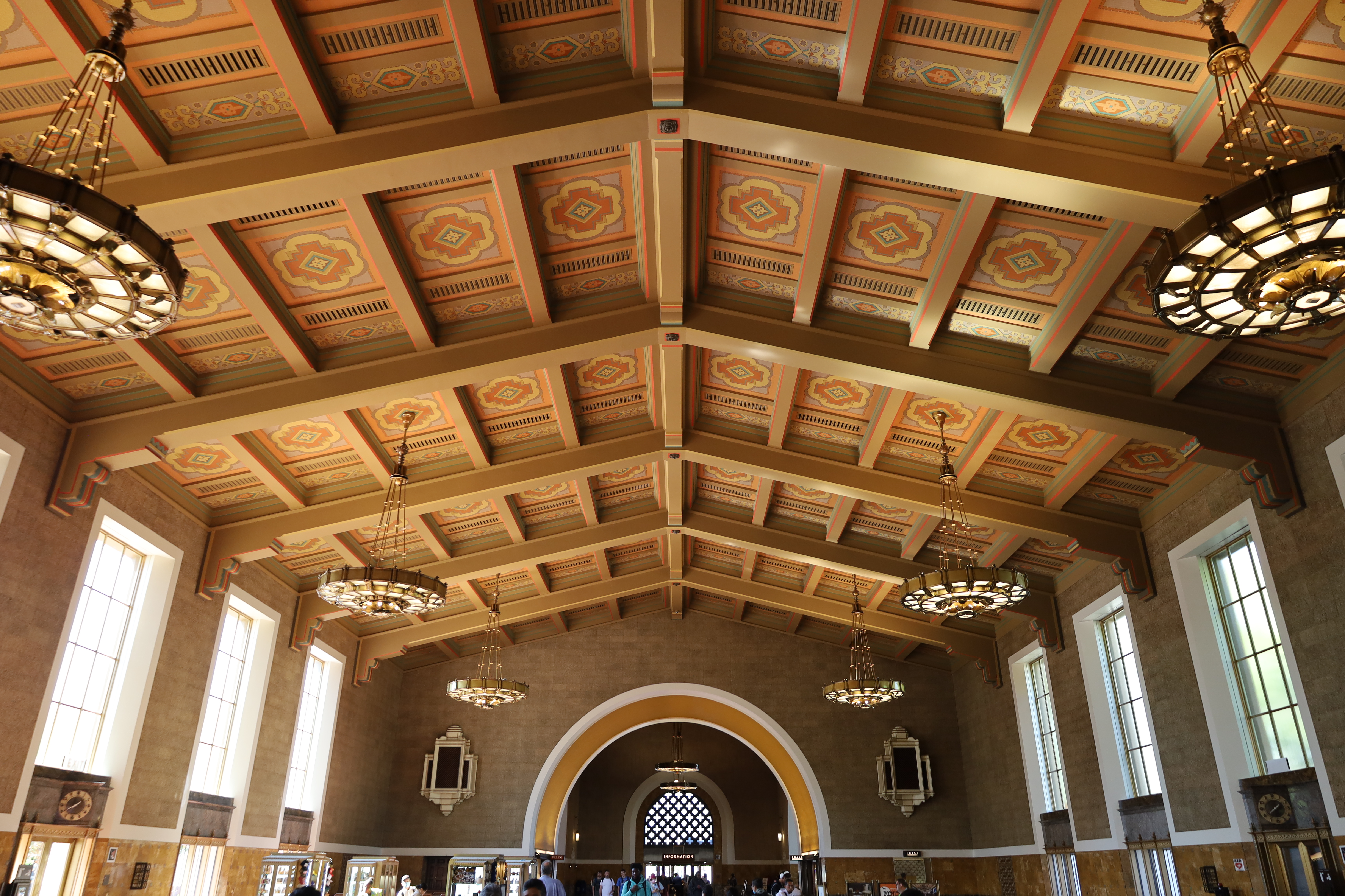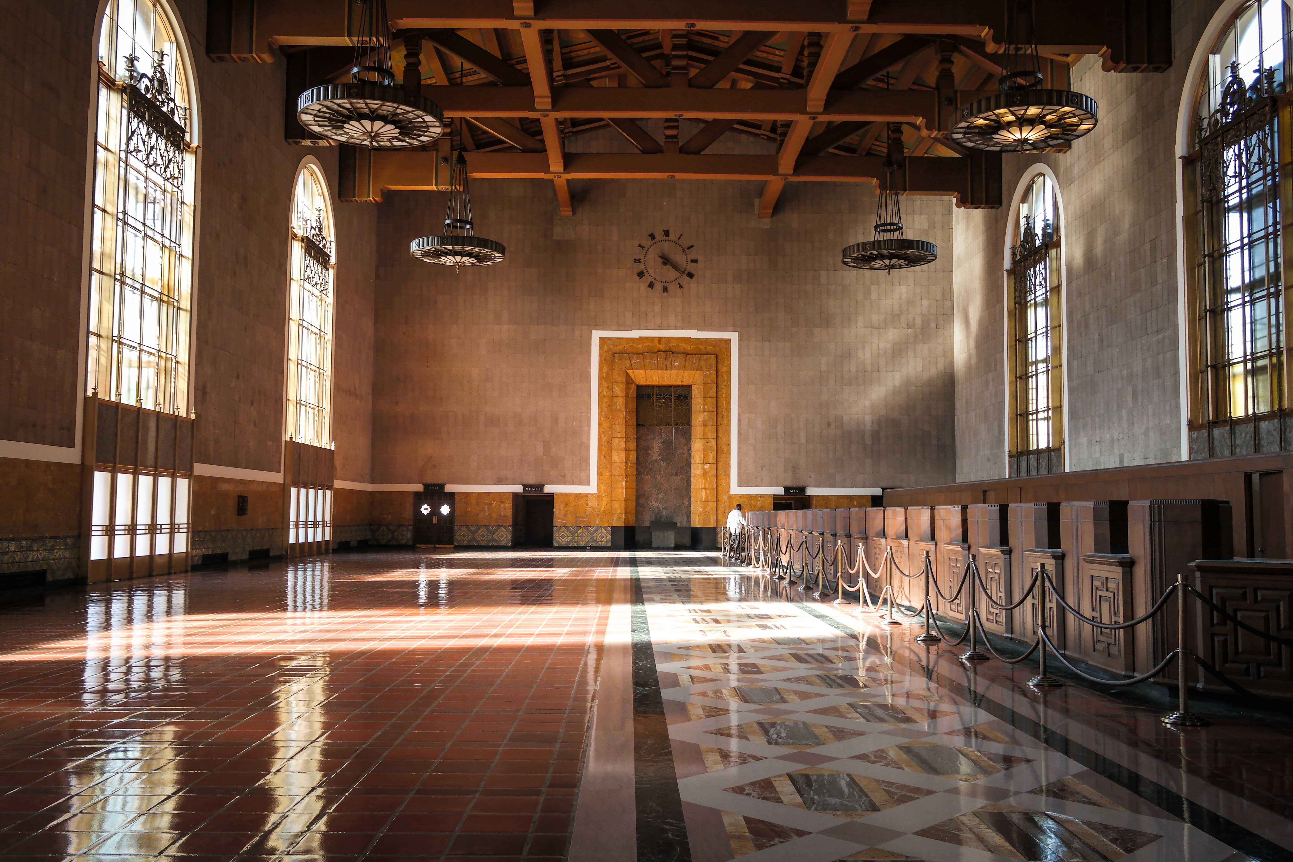원래 매표소는 약 18.90m 높이의 천장과 약 33.53m 길이의 카운터를 가지고 있다. 일반인에게는 공개되지 않지만, 가끔 영화 촬영이나 특별 행사를 위해 대여된다.[27][34][28][29] 역에는 통가와 피오 피코와 같은 라틴계 정착민의 에칭이 있는 벽이 있는 수족관을 포함한 공공 미술이 추가되었다.[30]