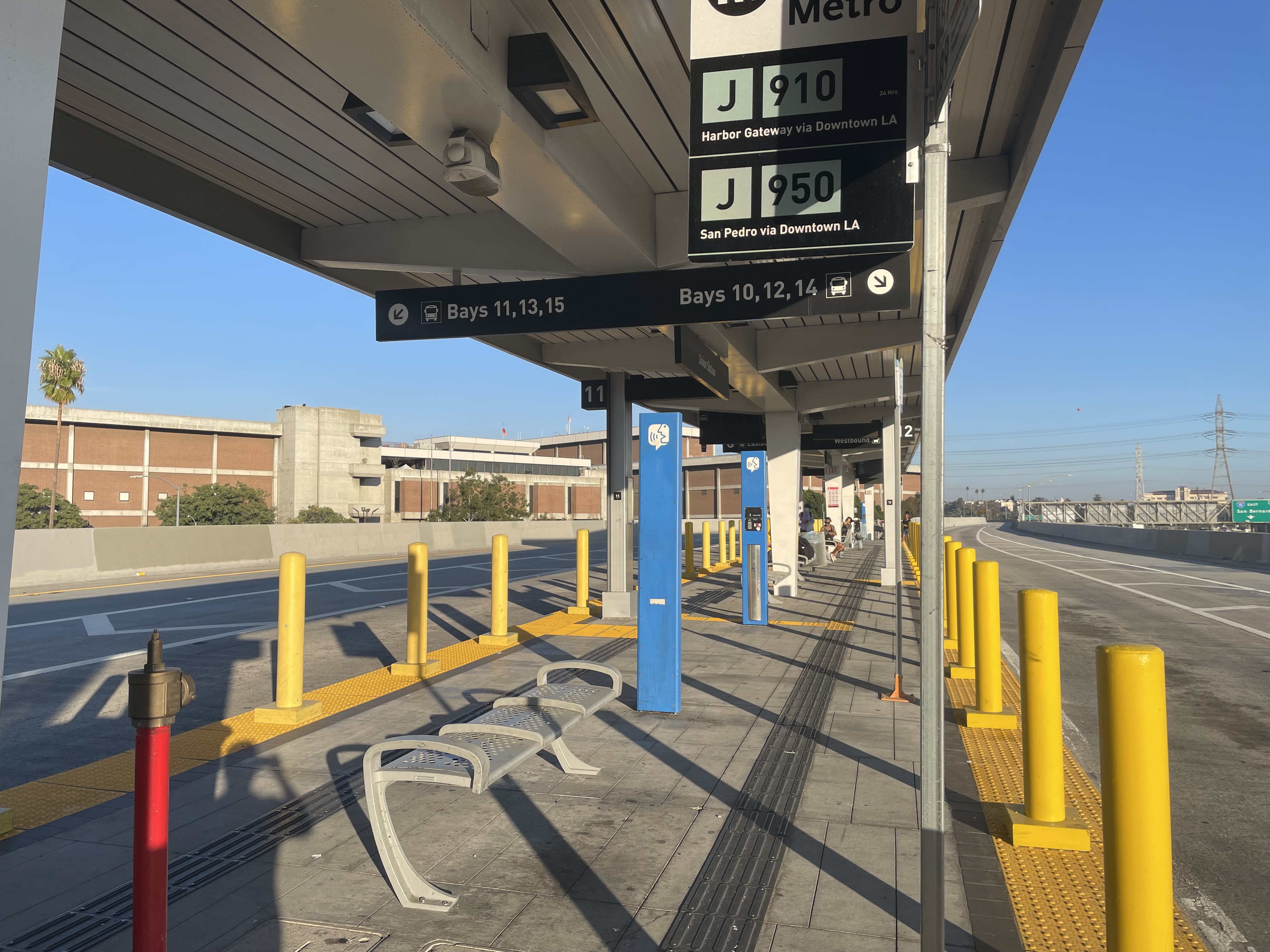 역 정면 도로 건너편에는 로스앤젤레스 발상지인 올베라 스트리트가 있어 로스앤젤레스의 볼거리 중 하나이다. 역에서 홈 아래 연결 통로를 통과하면 로스앤젤레스 군 광역 교통국의 빌딩과 고객 센터(평일만 영업)가 있다. 계단을 올라 밖으로 나가면 버스 터미널인 팻사우라스 트랜싯 프라자가 있다.