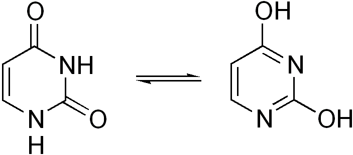 유라실은 아마이드-이미드산 호변 이성질체 전환을 겪는다. 락탐 구조는 유라실의 가장 일반적인 형태이다.[52]