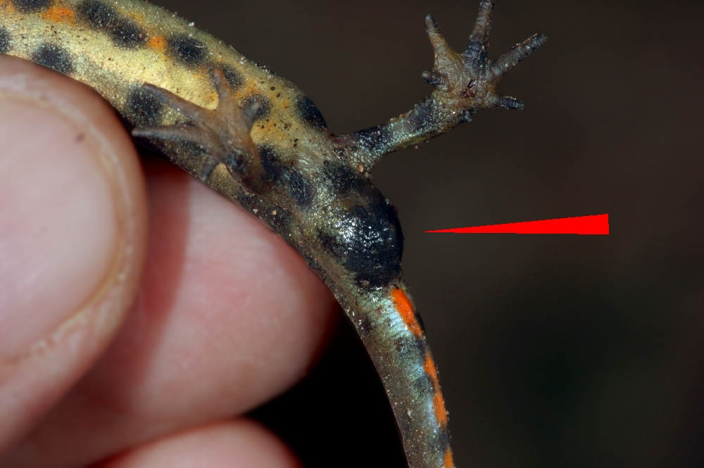 물속에서 생활하는 번식기가 되면 수컷은 뚜렷한 이차 성징을 보인다. 등과 꼬리를 따라 피부가 늘어나 만들어진 볏이 끊김 없이 이어진다. 이 볏은 몸통 중간 부분에서는 높이가 1mm 에서 1.5mm 정도지만 꼬리 쪽으로 갈수록 더 높아진다. 꼬리에는 아래쪽으로도 지느러미가 발달하며 끝은 뾰족하다. 번식기 수컷의 총배설강(소화, 배설, 생식 기능을 하는 하나의 구멍)은 부풀어 오르고 둥근 모양에 어두운 색을 띤다. 뒷발에는 발가락 사이에 물갈퀴와 유사한 막(발가락 덮개)이 발달하는데, 그 정도는 아종에 따라 다르다. 전반적으로 번식기 수컷의 색깔은 육상 단계일 때보다 훨씬 화려해진다. 어두운 반점은 더 커지고, 볏에는 종종 수직 방향의 어둡고 밝은 띠무늬가 나타난다. 머리에는 5~7개의 세로 줄무늬가 생긴다. 꼬리 가장자리는 붉은색을 띠며 은청색 광택과 검은 반점이 나타난다. 반면 암컷은 번식기에도 볏이나 발가락 덮개가 발달하지 않으며, 낮고 직선적인 꼬리 지느러미만 생긴다. 색깔도 수컷보다 훨씬 칙칙하다.