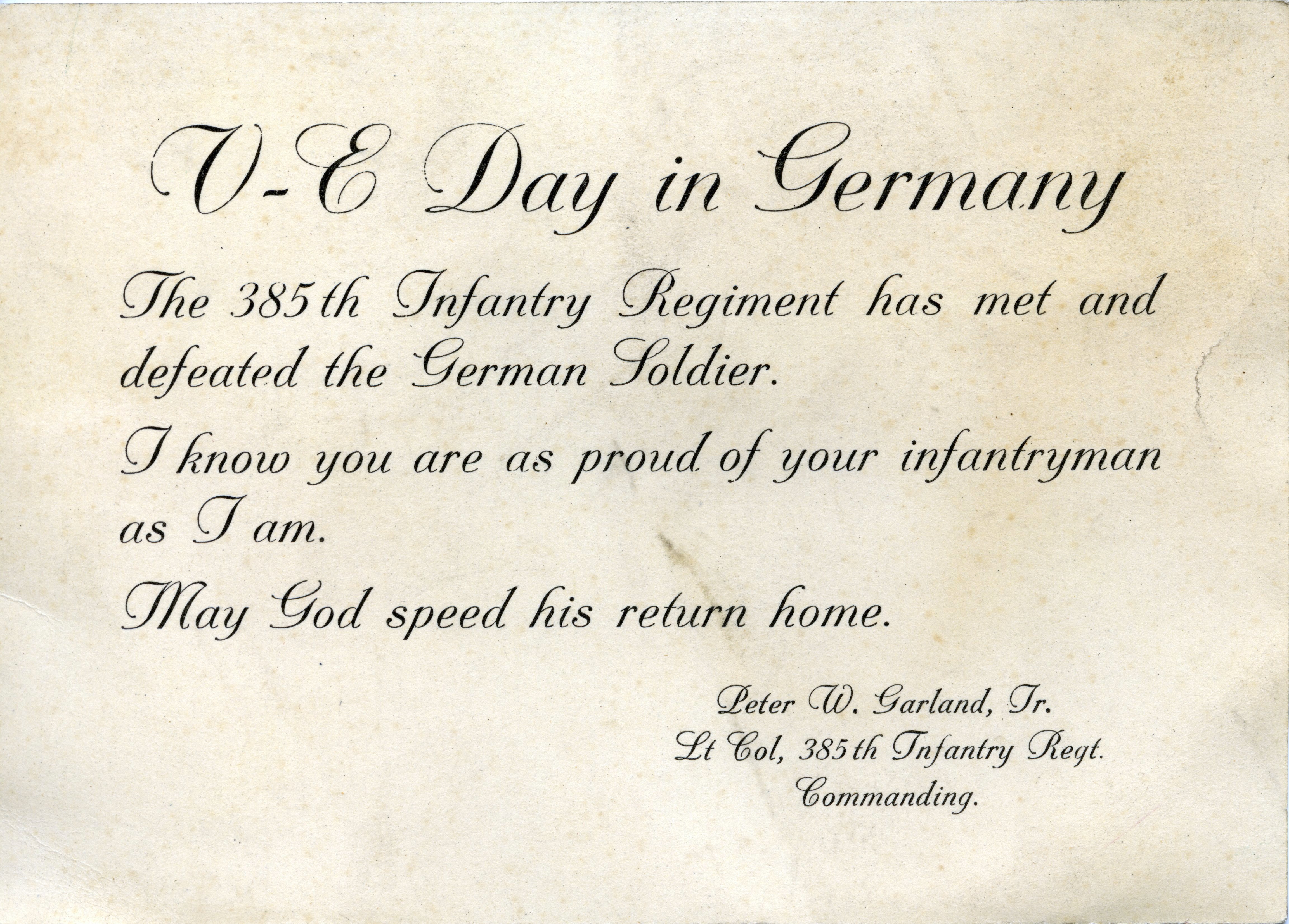V-E 데이는 1945년 5월 8일, 독일이 공식적으로 항복한 날을 기념하여 유럽 전역에서 지정되었다. 그러나 중부 유럽 시간으로 5월 8일 23시 01분이 작전 종료 시각이었기 때문에, 모스크바 시간으로는 자정을 넘긴 5월 9일이 구소련 지역 대부분에서 전승절로 기념된다.프랑스에서는 5월 8일에 프랑스령 알제리에서 전쟁 종식을 축하하던 무슬림들이 프랑스 식민 제국 당국과 ''피에-누아'' 정착민 민병대에 의해 학살당했다.[23][24][25] 이는 알제리 전쟁의 전조가 되었다.[27]