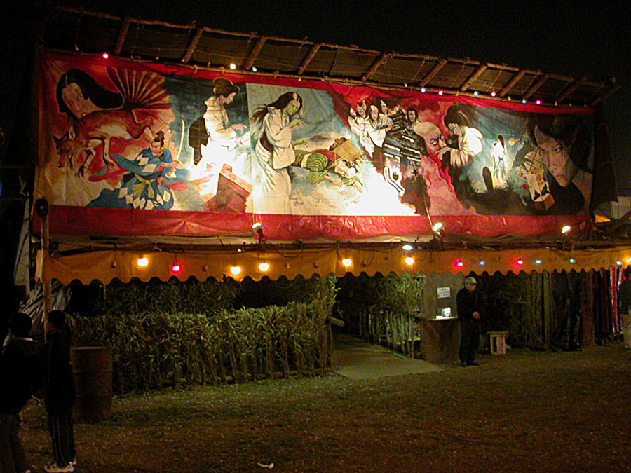 「余録」([[毎日新聞]]2014年8月18日)によれば、お化けや怪談が夏の風物詩となったのは[[鶴屋南北 (4代目)]]の歌舞伎からで、[[1836年]](天保7)年、江戸・[[回向院|両国回向院]] で「寺島仕込怪物問屋(てらしまじこみばけものどんや/寺島とは尾上菊五郎)」というが評判となる。「[[四谷怪談]]」など怪談ものの場面を[[からくり人形]]で見せた。これが日本で初の本格的化け物屋敷興行という。