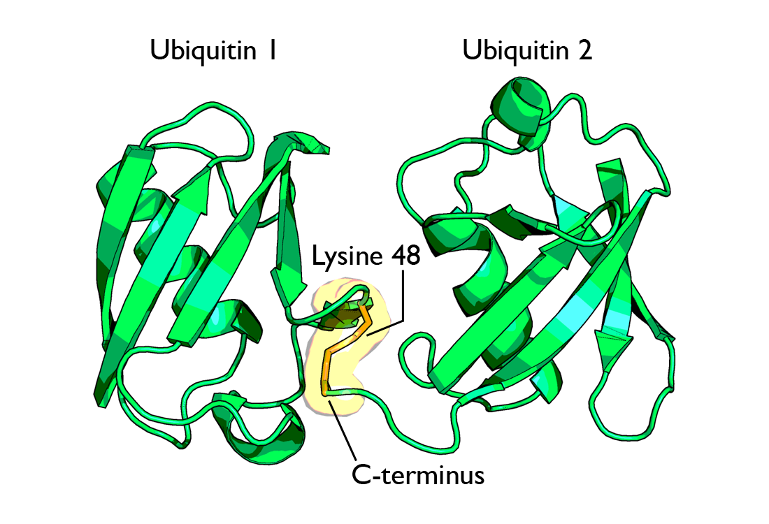 - '''K48 연결 폴리유비퀴틴 사슬''': 가장 먼저 발견되고 연구된 유형으로, 주로 단백질 분해 신호로 작용한다. 수명이 다하거나 손상된 단백질에 K48 연결 사슬(최소 4개의 유비퀴틴 분자)이 부착되면, 프로테아좀이라는 세포 내 단백질 분해 공장에서 인식되어 분해된다.[64] 유비퀴틴 분자 자체는 분해 직전에 분리되어 재활용된다.[65] 프로테아좀의 S5a/Rpn10 소단위체에 있는 유비퀴틴-상호작용 모티프(UIM)가 이 사슬을 인식한다.[57]