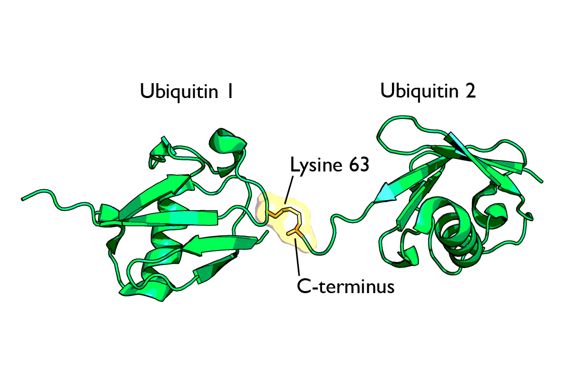 - '''K63 연결 사슬''': 유비퀴틴의 63번째 라이신(K63)을 통해 연결된 사슬이다. K48 사슬과는 달리 단백질 분해 신호로 작용하지 않는다. 대신 세포내이입, 염증 반응 조절, 단백질 번역, DNA 복구 등 다양한 세포 신호 전달 과정에 관여한다.[66] 세포 내에서 K63 사슬은 ESCRT-0 복합체(UIM을 포함하는 Hrs, STAM1 단백질 등으로 구성)에 의해 특이적으로 결합하며, 이를 통해 프로테아좀에 의한 분해를 피할 수 있다.[67][68]