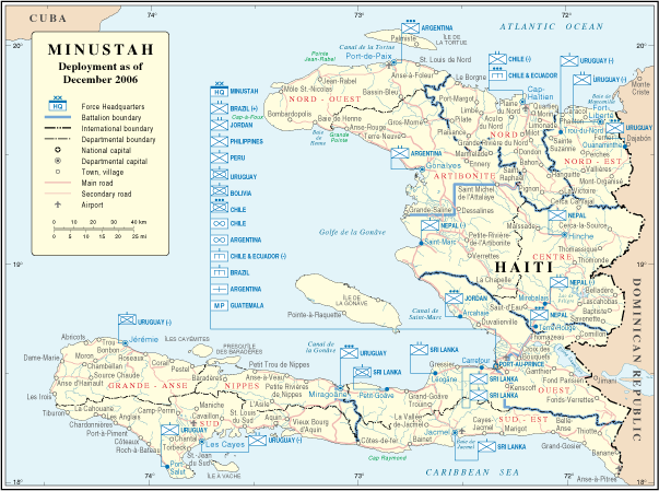 유엔 안전 보장 이사회 결의안 1542에 따라 설립된 유엔 아이티 안정화 미션(MINUSTAH)은 선거 기간 동안 안보와 보호를 강화하고, 아이티의 법치주의, 공공 안전 및 공공 질서를 회복하고 유지하는 데 도움을 주기 위해 민간 경찰을 포함한 자원을 사용해야 했다.[16]2006년 12월 기준 MINUSTAH 배치 지도는 다음과 같다.