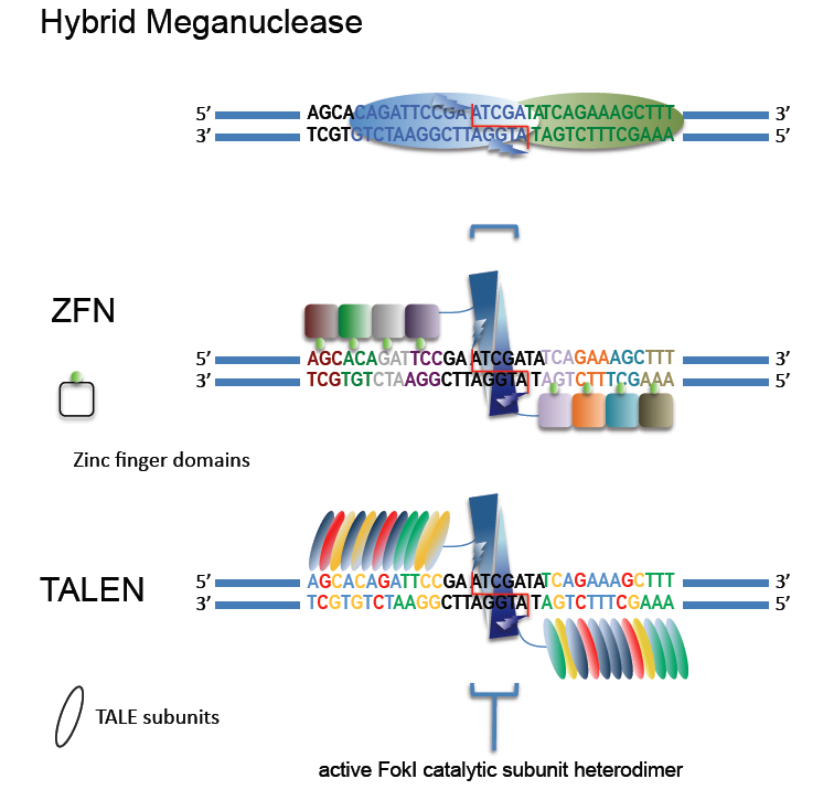 징크핑거 뉴클레아제(ZFN)와 TALEN 기술은 염기서열 비특이적인 DNA 절단 도메인을 기반으로 하며, 이 DNA 절단 도메인은 DNA 인식 펩타이드(징크핑거, 탈렌(TALEs, transcription activator-like effectors))와 연결될 수 있다.[213] 징크핑거 뉴클레아제는 비특이적인 DNA 절단 도메인과 징크핑거 모티프의 DNA 결합 도메인을 결합하여 이용하는 기술이다. 징크핑거 모티프는 여러 전사 인자에서 발견되며, 아연 이온을 포함하여 3차원 구조 형성에 중요한 역할을 한다. 징크핑거의 c-말단 부분은 DNA 서열을 특이적으로 인식한다.