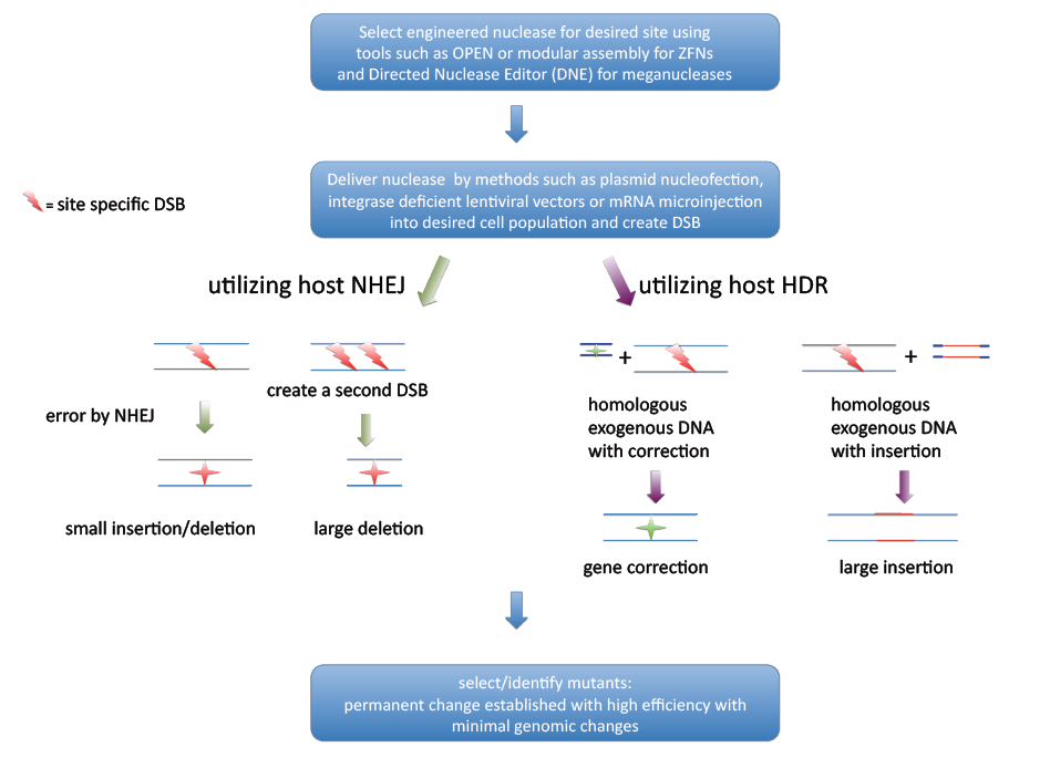 2018년에는 엔지니어링된 뉴클레아제, 즉 "분자 가위"가 유전체 편집의 일반적인 방법으로 사용되었다. 이러한 뉴클레아제는 유전체의 원하는 위치에 특정 위치의 이중 가닥 절단(DSB)을 생성한다. 유도된 이중 가닥 절단은 DNA 복구 과정에서 비상동 말단 연결(NHEJ) 또는 상동 재조합(HR)을 통해 표적 돌연변이(편집)를 발생시킨다.