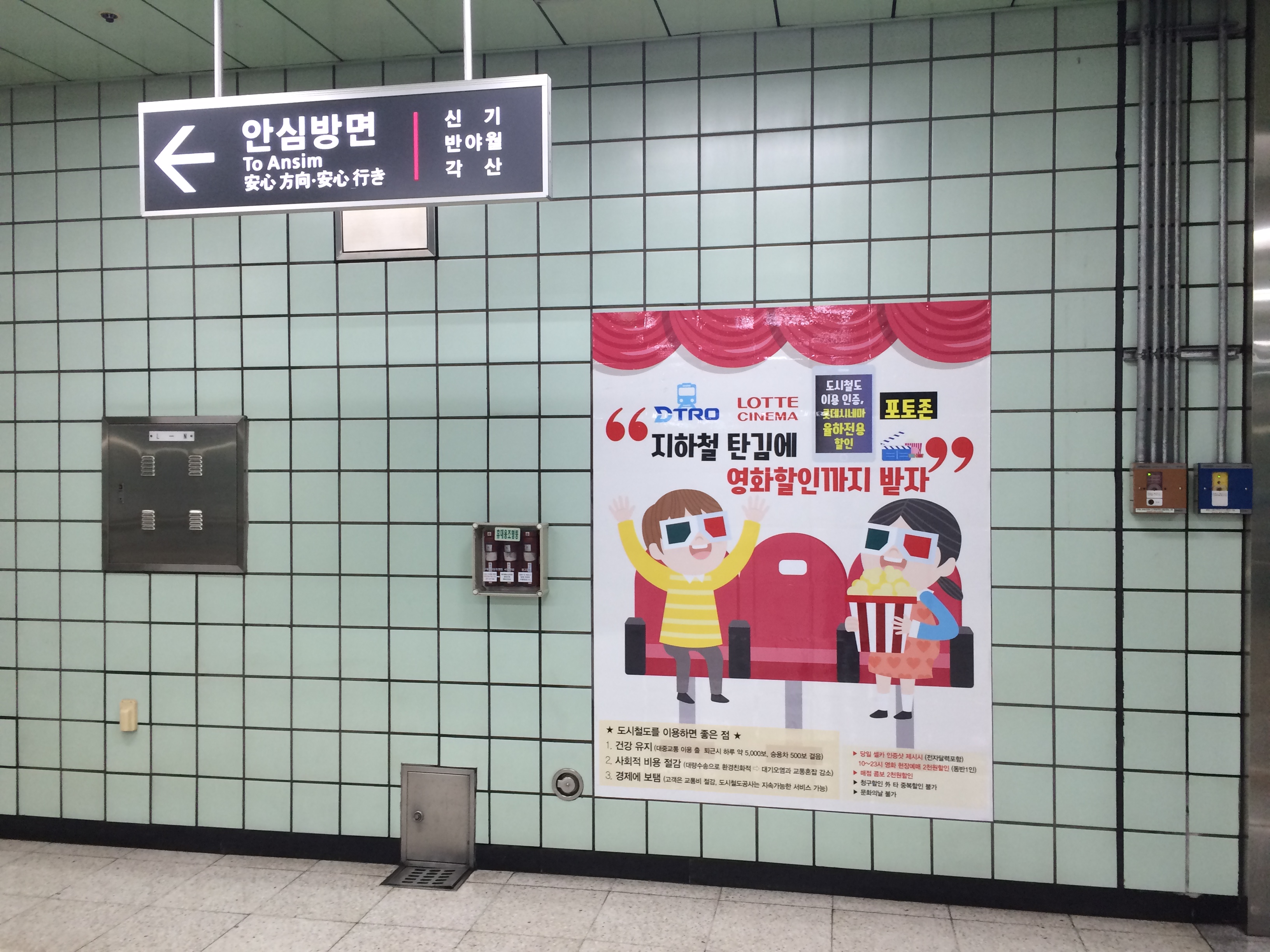 - 역세권 할인 혜택: 율하역 대합실 상하선 끝 부근에 지하철 이용 포토존이 설치되어 있다. 포토존에서 사진 촬영 후 롯데시네마 율하점에 인증샷을 보여주면 영화 할인 혜택을 받을 수 있다.