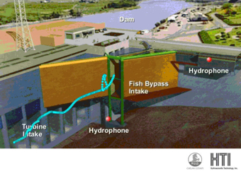 현재 음향 태그는 수력 발전 댐의 전환 및 유도 구조물에 접근하는 어류를 모니터링하는 데 가장 일반적으로 사용된다. 이를 통해 수력 발전 댐 시설, 공공 유틸리티 지구 및 지방 자치 단체는 어류(대부분 연어 어린 물고기)가 사용하는 특정 이동 경로를 평가하고, 어류 폐사가 발생하는 위치를 식별하며, 유체 역학적 조건 및/또는 기타 환경 매개변수와 관련된 어류의 행동을 평가할 수 있다. 궁극적으로 우회 효율성을 개선하고 어류 개체수를 보호하기 위해, 음향 태그 추적 시스템은 이동하는 연어 개체수 보존에 있어 중요한 돌파구이다. 컬럼비아 강에서 작동하는 음향 태그 추적 시스템의 예는 https://www.gcpud.org/stewardship.htm 그랜트 카운티의 최신 https://www.gcpud.org/hydro/bypass.htm 애플리케이션 또는 https://www.chelanpud.org/ 첼란 카운티의 최신 https://web.archive.org/web/20070930092338/http://www.chelanpud.org/tools-to-help-fish.html 애플리케이션을 참조하면 된다.