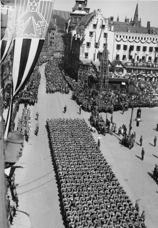 비행기는 독일국의 국기(흑백적의 가로 삼색기)[39]가 게양된 성 로렌츠 교회 등의 상공을 지나 뉘른베르크 공항[40]에 착륙한다. 히틀러는 메르세데스-벤츠 770K 그로서를 타고 시내로 이동하며, 길가에 모인 시민들은 나치식 경례로 환호한다. 히틀러는 이들의 환호에 답하며 거위 남자 분수, 콘라트 그뤼벨 동상, 바이서 투름 등을 지난다.