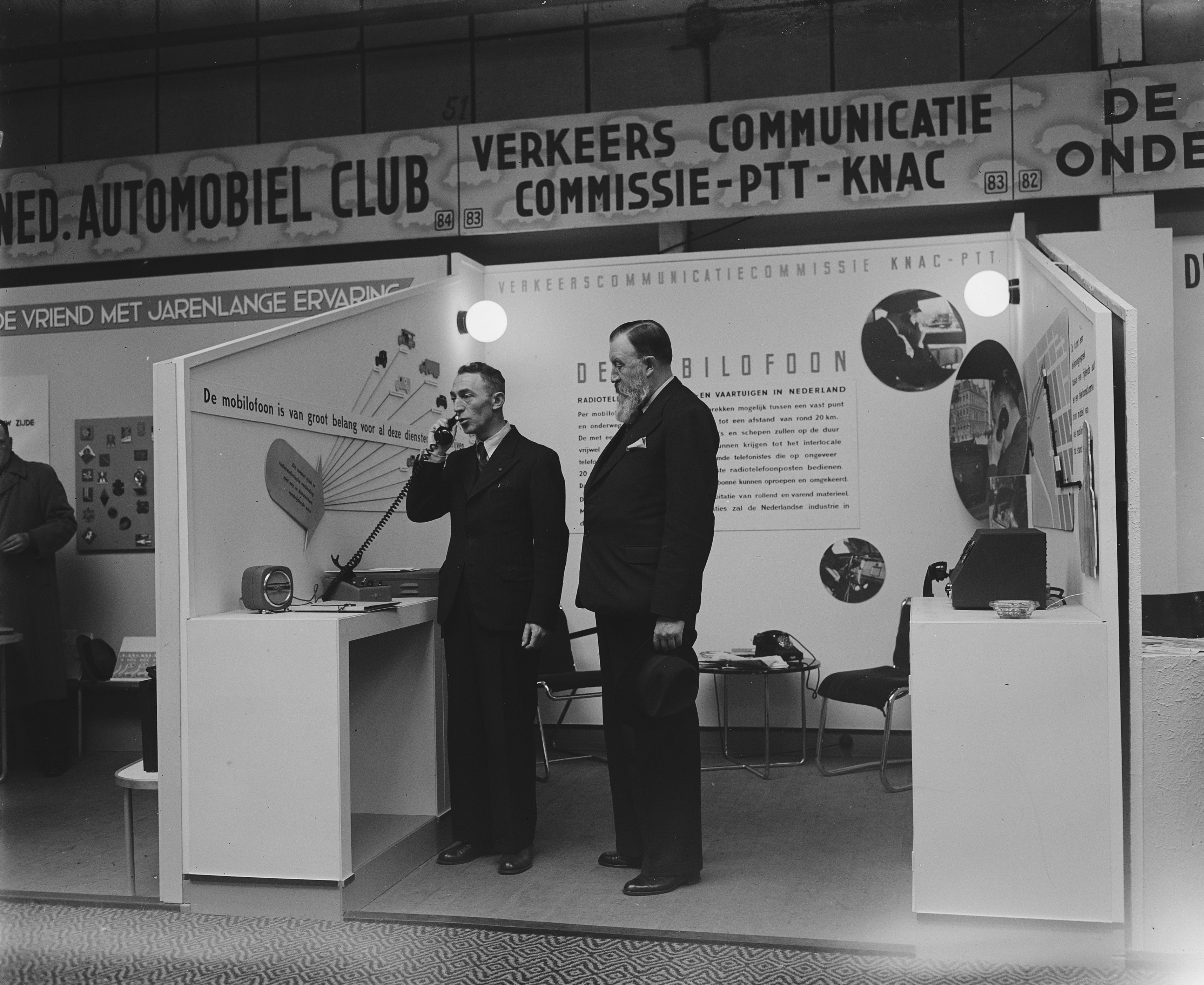 1948년 암스테르담 국제 모터쇼(AutoRAI)에서 네덜란드 왕립 자동차 클럽(KNAC)과 네덜란드 우정, 전신 및 전화청(PTT)이 공동으로 선보인 최초의 네덜란드 차량 또는 수상 전화("Mobilofoon") 부스.