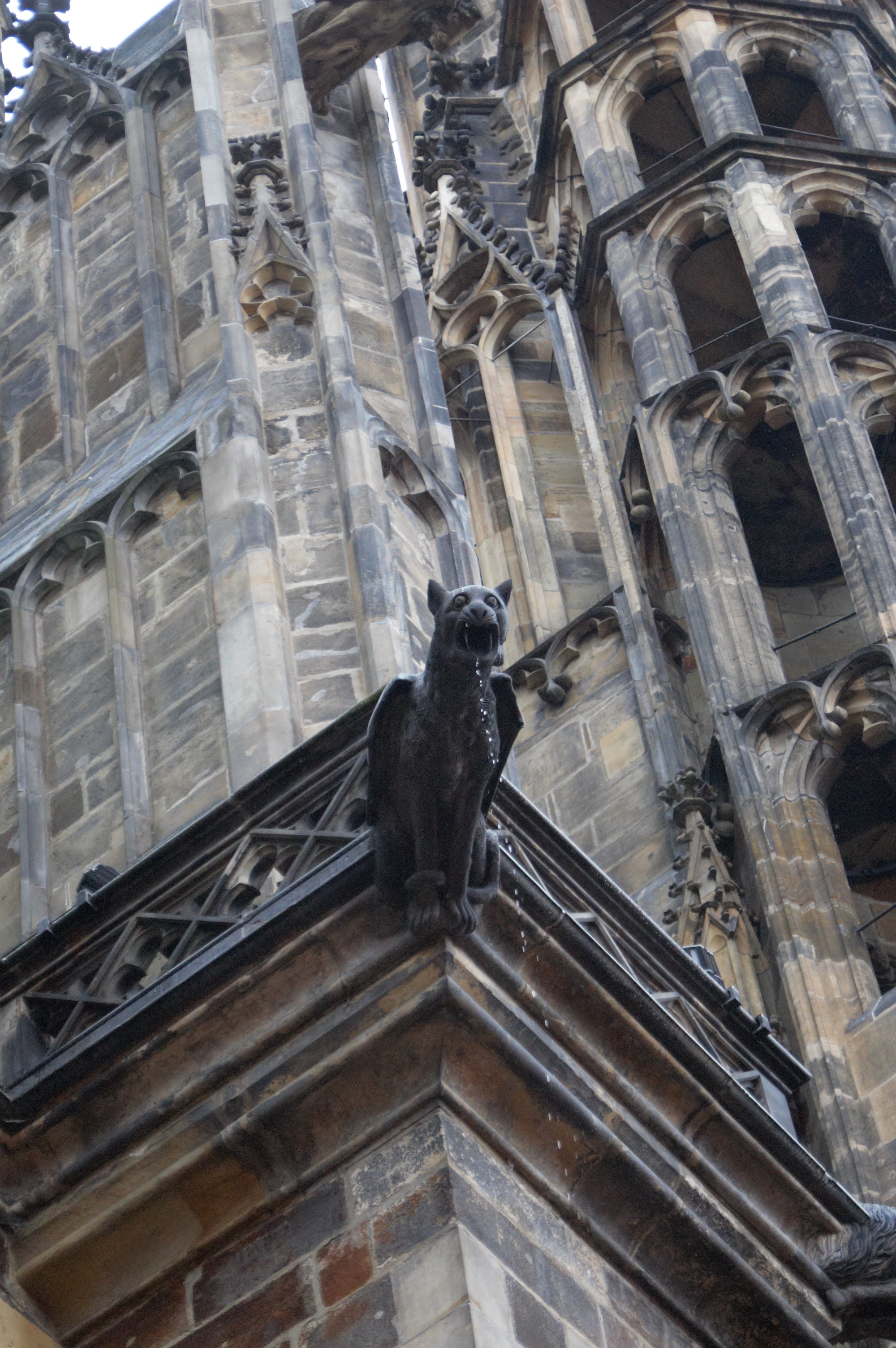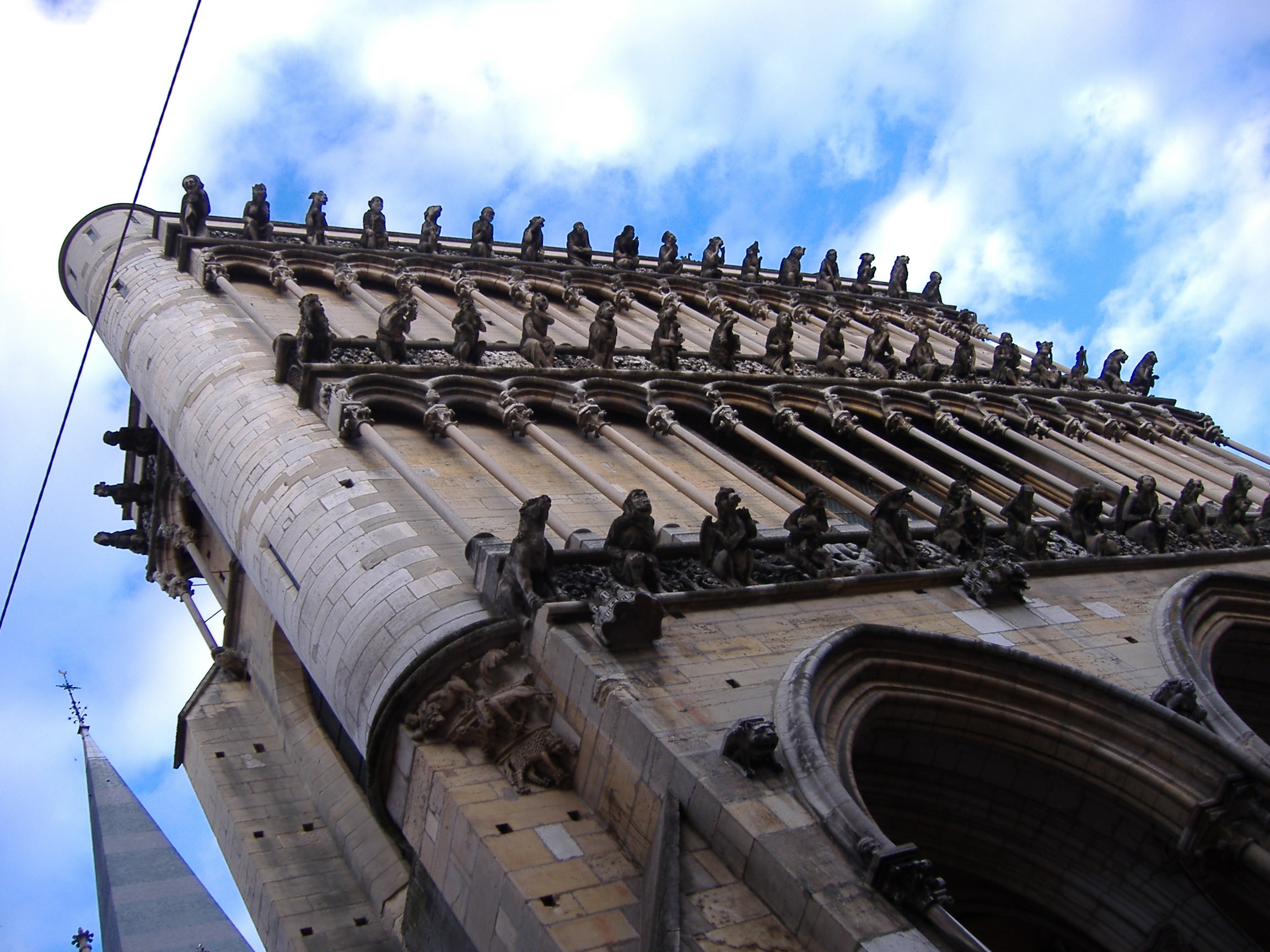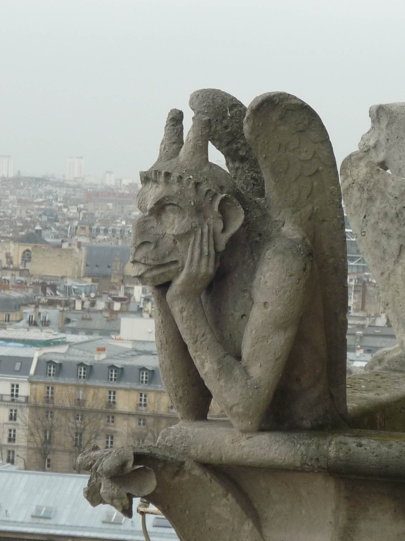파리의 노트르담 대성당에 많이 보이는 괴물군은 가고일로 유명하지만, 대부분은 19세기에 이루어진 복원 때 비올레르 뒤크 등이 더한 것이다.[9] 원래 있던 외벽 조각은 프랑스 혁명 무렵에 거의 파괴되었다. 노트르담 대성당에는 종탑 기부의 난간에서 파리 시가지를 굽어보는 듯이 설치된 악마 같은 상이 있는데, 이 괴물상은 낙수구 역할을 하지 않으며, 키마이라 또는 그로테스크라고 불린다.