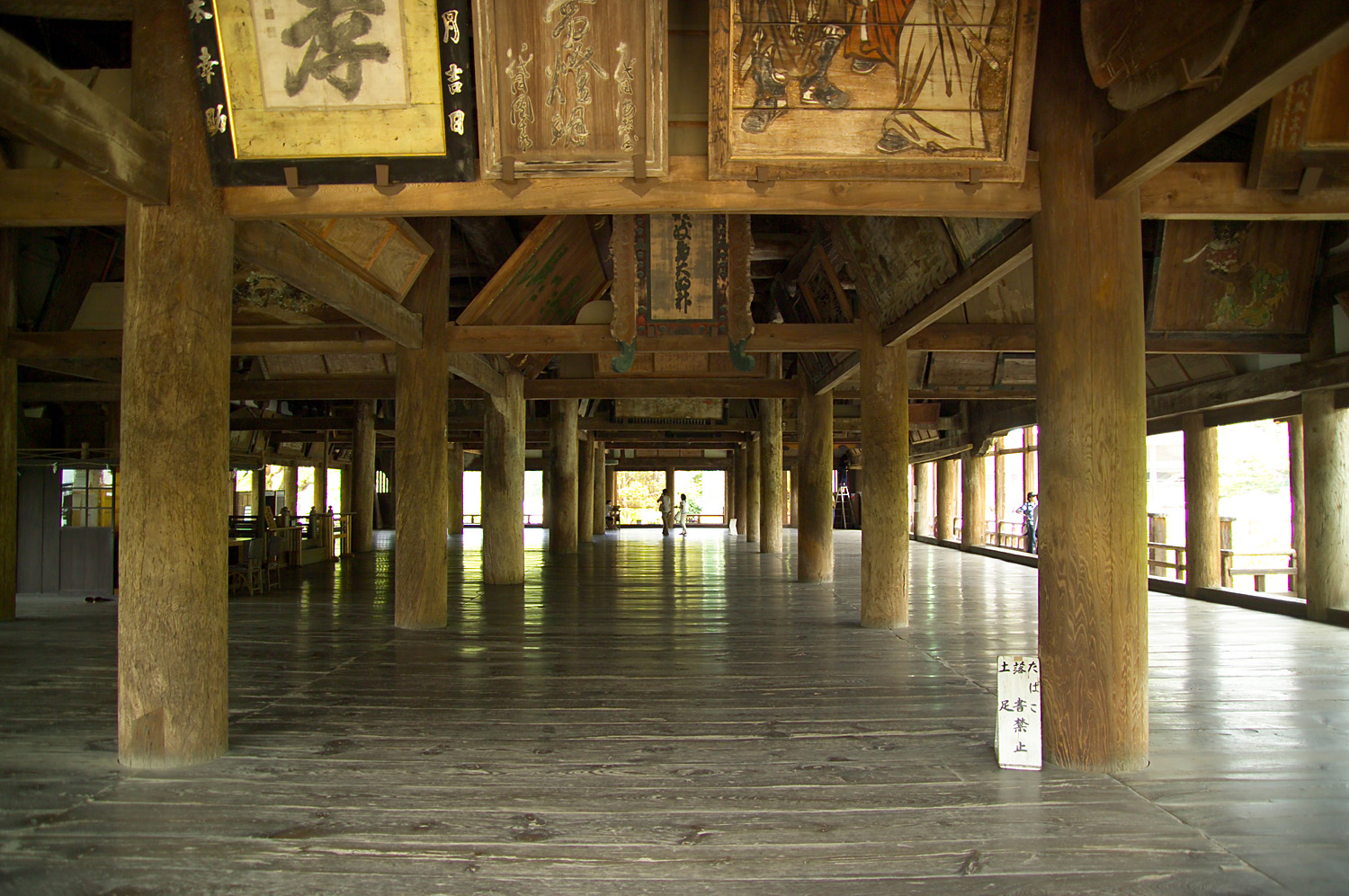도요토미 히데요시도 규슈(九州) 원정 도중에 이쓰쿠시마 신사에 참배하고, 대경당(大経堂)(현재: 센조각(千畳閣))을 건립하였다.