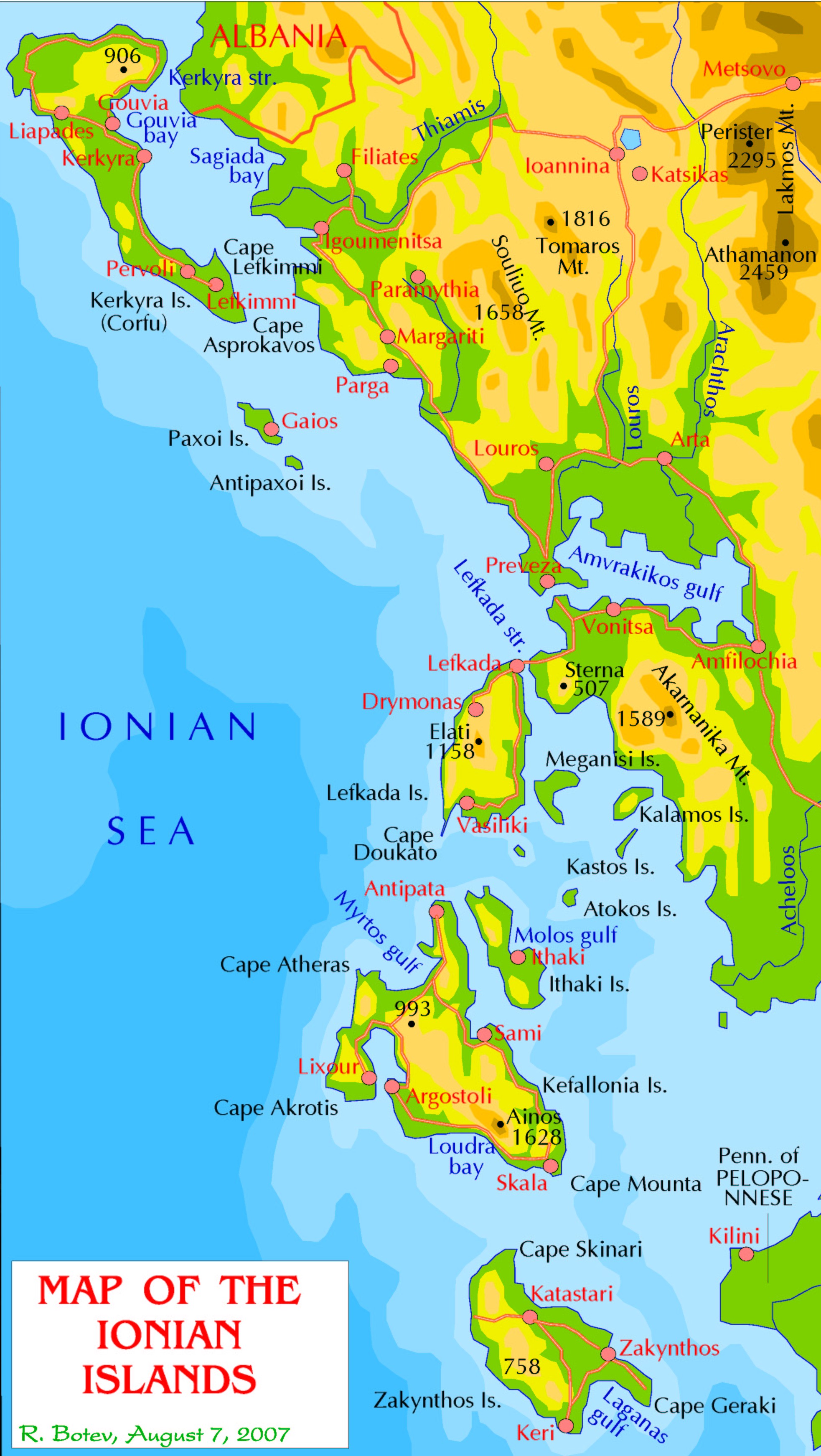 1185년에는 시칠리아의 윌리엄 2세가 이오니아 제도의 대부분을 점령하여 동로마 제국 밑에 남은 것은 케르키라섬과 레프카다섬 등 몇몇 섬들뿐이었다. 시칠리아 왕국령이 된 지역에는 케팔로니아와 자킨토스 백작령이 설치되었다. 1357년, 케팔로니아·자킨토스 백작령은 레프카다섬과 이타키섬과 합쳐져 레우카디아 공국이 되었고, 프랑스인과 이탈리아인이 공작이 되었다.