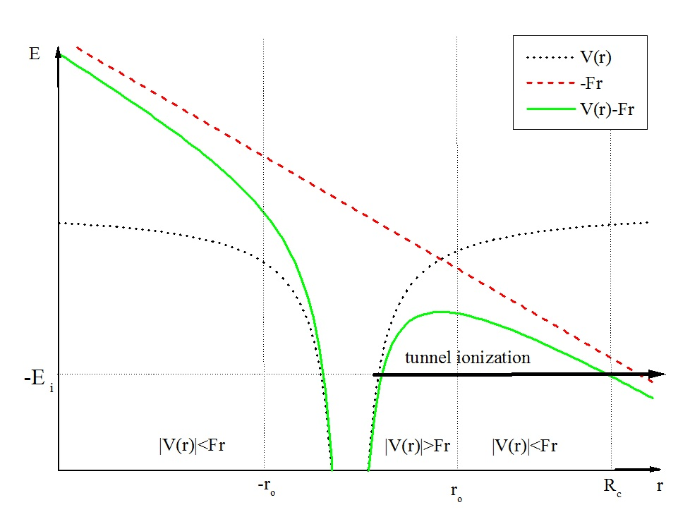 켈디시[28]는 MPI 과정을 원자의 기저 상태에서 볼코프 상태로의 전자 전이로 모델링했다.[29] 이 모델에서는 레이저 장에 의한 기저 상태의 섭동은 무시되고 이온화 확률을 결정하는 원자 구조의 세부 사항은 고려되지 않는다. 켈디시 모델의 가장 큰 어려움은 전자의 최종 상태에 대한 쿨롱 상호 작용의 영향을 무시한 것이다. 그림에서 볼 수 있듯이, 핵으로부터 더 먼 거리에서 레이저의 퍼텐셜에 비해 쿨롱 장의 크기가 매우 작지 않다. 이것은 핵 근처 영역에서 레이저의 퍼텐셜을 무시함으로써 이루어진 근사와 대조적이다. 페렐로모프 등[30][31]은 더 먼 핵간 거리에서 쿨롱 상호 작용을 포함했다. 그들의 모델(PPT 모델)은 단거리 퍼텐셜에 대해 도출되었으며 준고전적 작용에 대한 1차 보정을 통해 장거리 쿨롱 상호 작용의 효과를 포함한다. 라로셸 등[32]은 티타늄 사파이어 레이저와 상호 작용하는 희귀 기체 원자의 이온 대 강도 곡선에 대한 이론적으로 예측된 값을 실험 측정값과 비교했다. 그들은 PPT 모델이 예측한 총 이온화율이 켈디시 매개변수의 중간 영역에서 모든 희귀 기체에 대한 실험적 이온 수율과 매우 잘 일치한다는 것을 보여주었다.