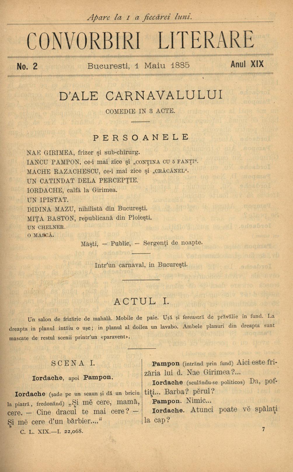 이온 루카 카라지알레는 1873년 G. Dem. Teodorescu의 자유주의적 성향의 풍자 잡지 ''Ghimpele''에 시와 유머러스한 연대기를 게재하며 문학계에 데뷔했다.[48] 그는 ''Car.''와 ''Palicar'' 등 다양한 필명으로 기사를 게재했다.[48] 그는 어머니와 누이의 생계를 책임져야 했기 때문에 편집진과 인쇄소에서 기본적인 업무를 수행했다.[49] 부쿠레슈티로 돌아온 그는 "적색당"으로 통칭되는 자유주의 경향의 급진 및 공화주의 분파와 더욱 밀접하게 관련되었다.[50] 그는 C. A. 로세티의 연설을 통해 포퓰리즘 담론에 정통하게 되었다.[50] ''Ghimpele''에서 일하면서 공화주의 작가 N. T. 오라샤누와 알게 되었다.[51]