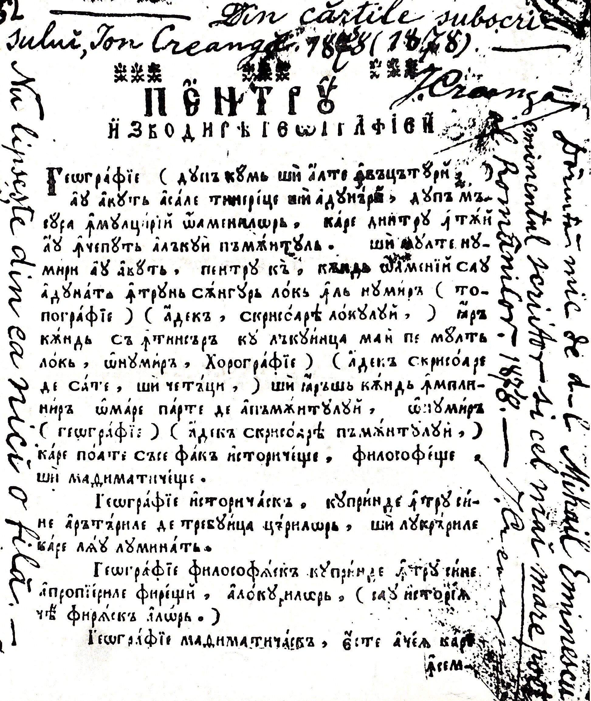 그의 작품 어린 시절의 추억 첫 부분에 묘사된 목가적인 시기를 보낸 후, 크레앙거는 당시 동방 정교회에서 관리하던 정규 학교에 입학했다. 그는 학교에서 반항적인 태도를 보이고 무단결석을 일삼는 것으로 알려졌다.[2] 당시 동급생 중에는 스마란디타 포피(훗날 스마란다 포세아)라는 여학생이 있었는데, 크레앙거는 수십 년간 만나지 못했음에도 성인이 되어서까지 그녀에 대한 애정을 간직했다.[10] 그는 또래 튜터 방식을 통해 키릴 문자 읽고 쓰는 법을 배웠다. 그의 감독 교사였던 바실 일리오아이에는 1848년 이전에 길거리에서 올가미에 걸려 강제로 몰다비아 군대에 징집되었다.[2] 그의 "추억"에서 술주정뱅이로 묘사된 또 다른 교사가 1848년 말 콜레라로 사망하자, 외할아버지 다비드 크레안거는 손자를 브로슈테니에 있는 비슷한 학교로 보내 이르니카라는 중년 여성에게 맡겼다.[11] 크레앙거는 비스트리차 강 가에 있는 이르니카의 외딴집에서 몇 달을 보냈으나, 염소와 가까이 지내다 옴에 걸려 급히 피피리그로 돌아와야 했다. 그는 증조할머니 나타시아가 능숙하게 사용했던 민간 요법인 자작나무 추출물로 스스로를 치료했다.[2]