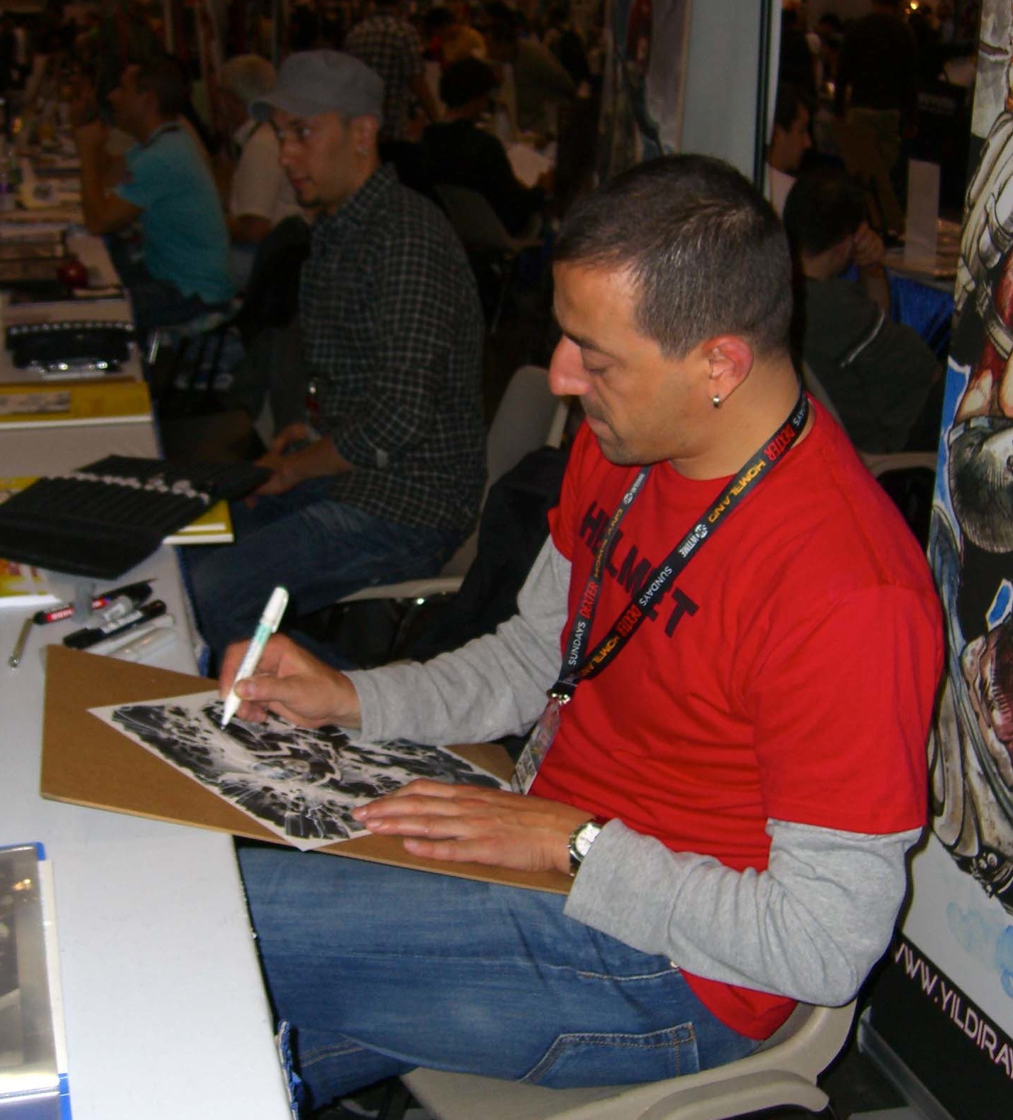 츠나르가 뉴욕 코믹콘에서 스케치하고 있다. 그의 왼쪽에는 동료 터키 만화가 마흐무트 A. 아스라르가 있다.
