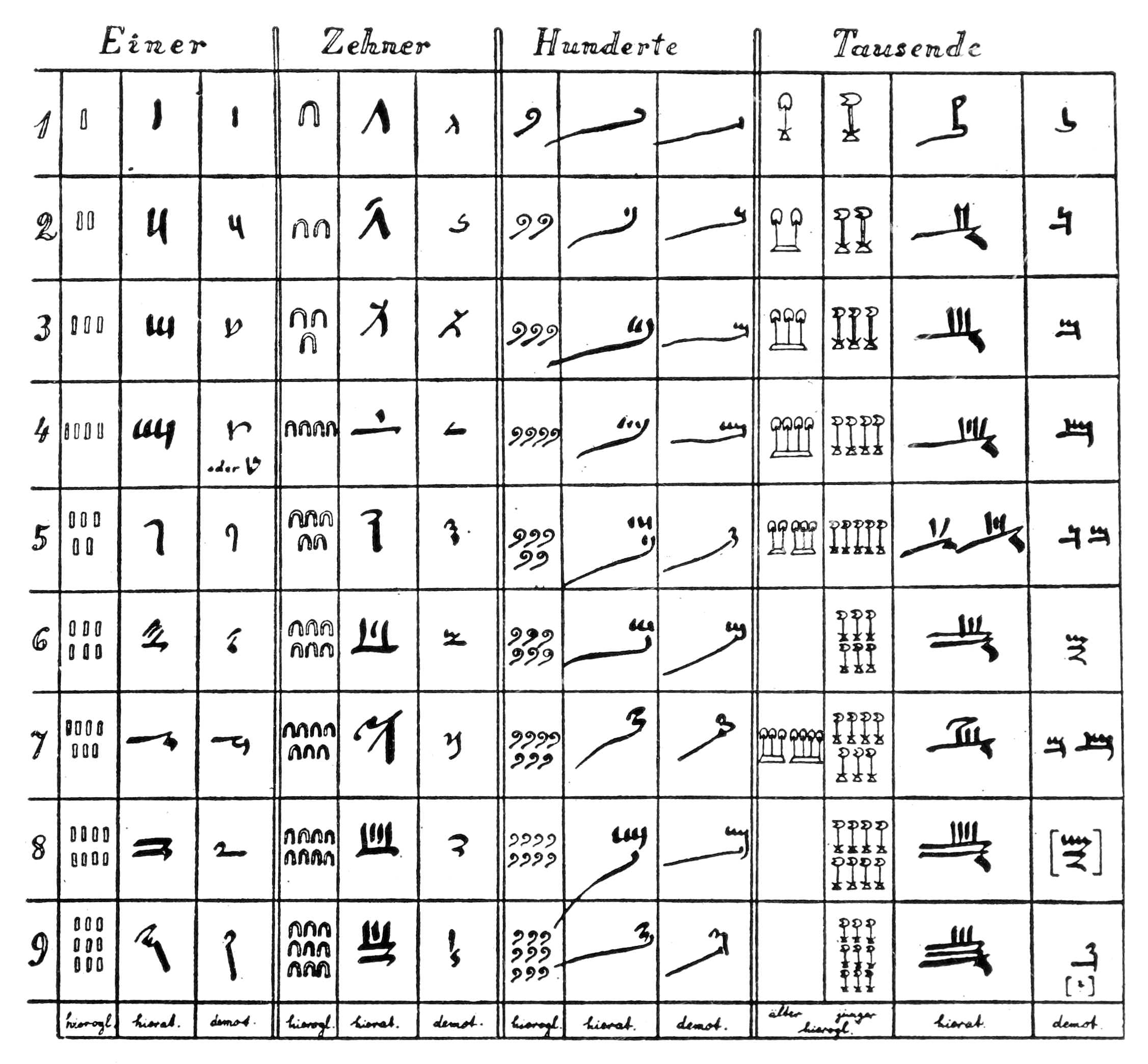 이집트 숫자 비교표(이집트 상형 문자, 이집트 속기, 데모틱 포함)