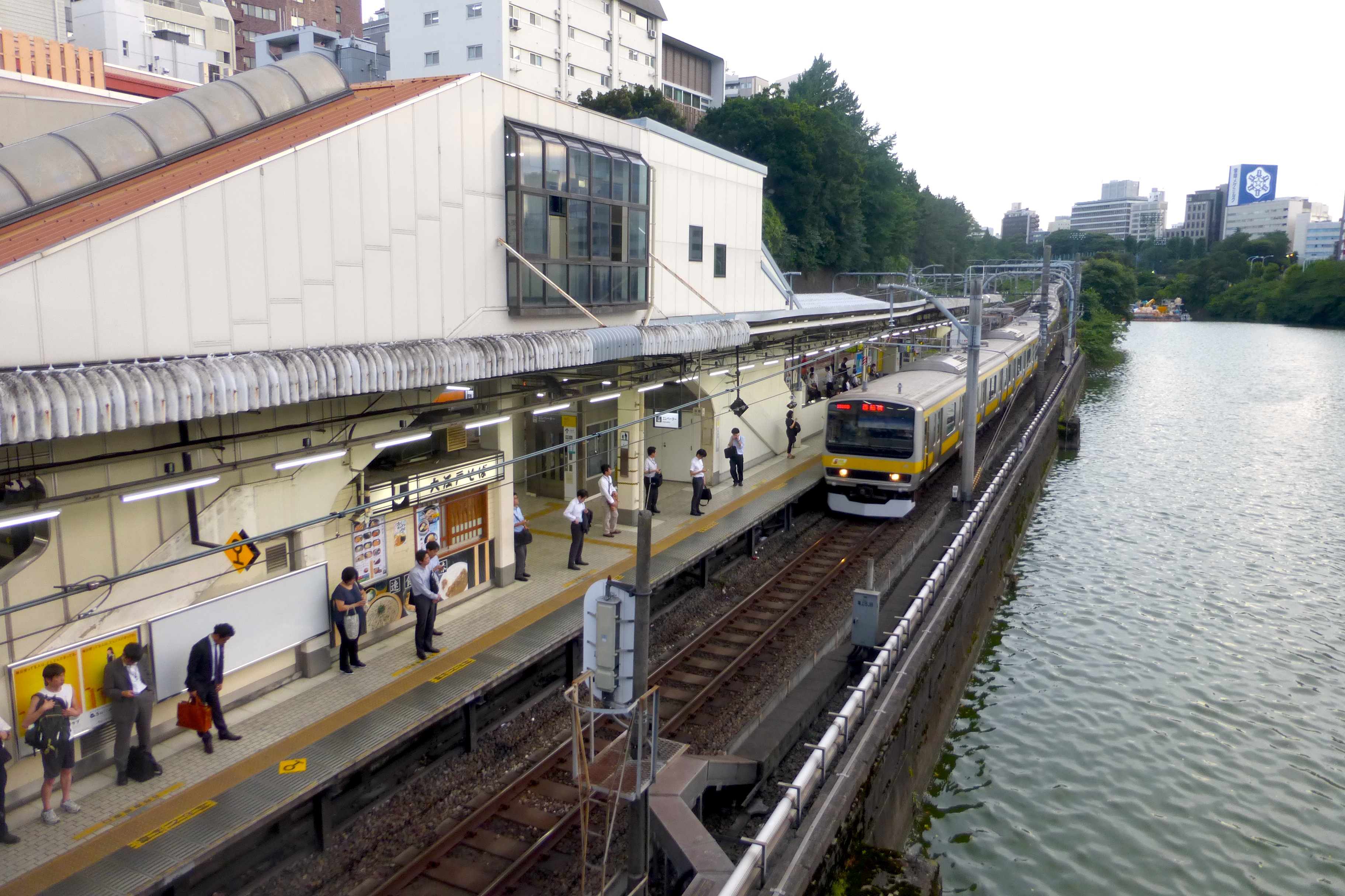 섬식 승강장 1면 2선의 지상역으로 교상역사를 가지고 있다. 출구는 신주쿠 방면에 1곳이 있으며, 다른 지하철 노선과의 환승 통로가 있다. 2021년에는 스마트 스크린도어가 설치되었다. 승강장 옆에는 외호(外濠)가 있어 낚시터와 벚꽃 명소로도 알려져 있다.전 홈에서는 스위치가 제작한 발차 멜로디(발차 사인음)를 사용하고 있다.[37][38]