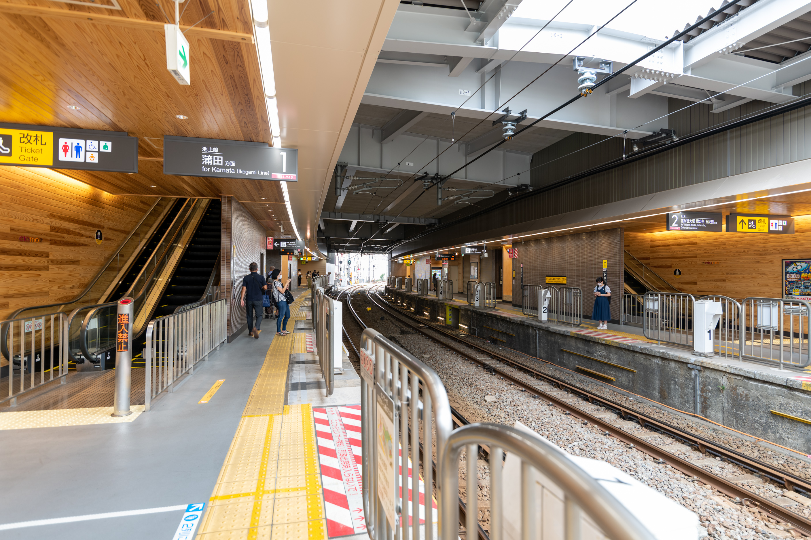 상대식 승강장 2면 2선의 지상역이다. 역사는 가마타 방면 승강장에 있으며, 고탄다 방면 승강장으로는 구내 건널목을 건너야 한다. 이케가미 선과 다마가와 선의 각 역에서는 원맨 운전을 실시함에 따라 안전성 향상을 위해 구내 건널목을 폐지하고 대부분 상하행선 승강장별로 역사와 개찰구를 정비하였지만, 이케가미 역은 개찰구를 신설할 수 있는 용지가 없어 구내 건널목을 남겼다. 현재는 도큐 선에서 유일한 여객용 구내 건널목이다.[8][9]