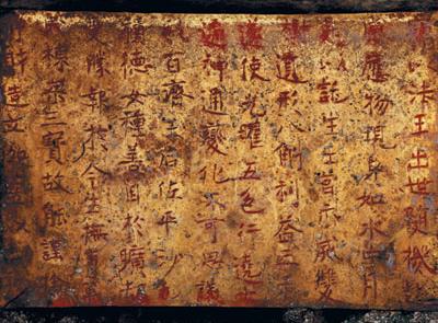 발굴 조사 중 서탑에서 금제 사리기가 출토되었는데, 여기에는 양면에 한문으로 미륵사 건립 시기와 경위를 적은 명문이 새겨져 있다. 금으로 새긴 글자에는 붉은색 안료인 주칠(朱漆)을 입혔는데, 이는 중요한 유물이나 예술 작품에만 사용되는 기법이었다.[6]