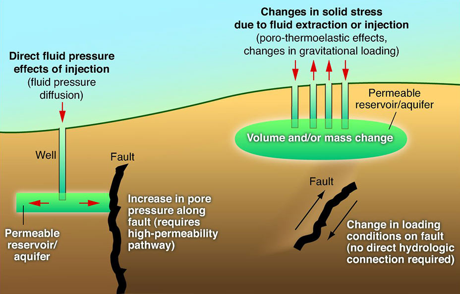 - 폐수 주입: 석유 시추나 천연가스 채취 과정에서 발생하는 폐수를 처리하기 위해 땅속에 주입하면 지층의 공극 수압이 증가하여 지진이 발생할 수 있다.