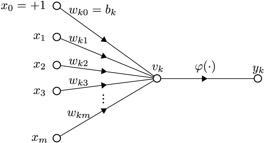 m개의 입력을 받는 k번째 인공 뉴런의 출력은 활성화 함수 φ를 사용하여 다음과 같이 표현된다.