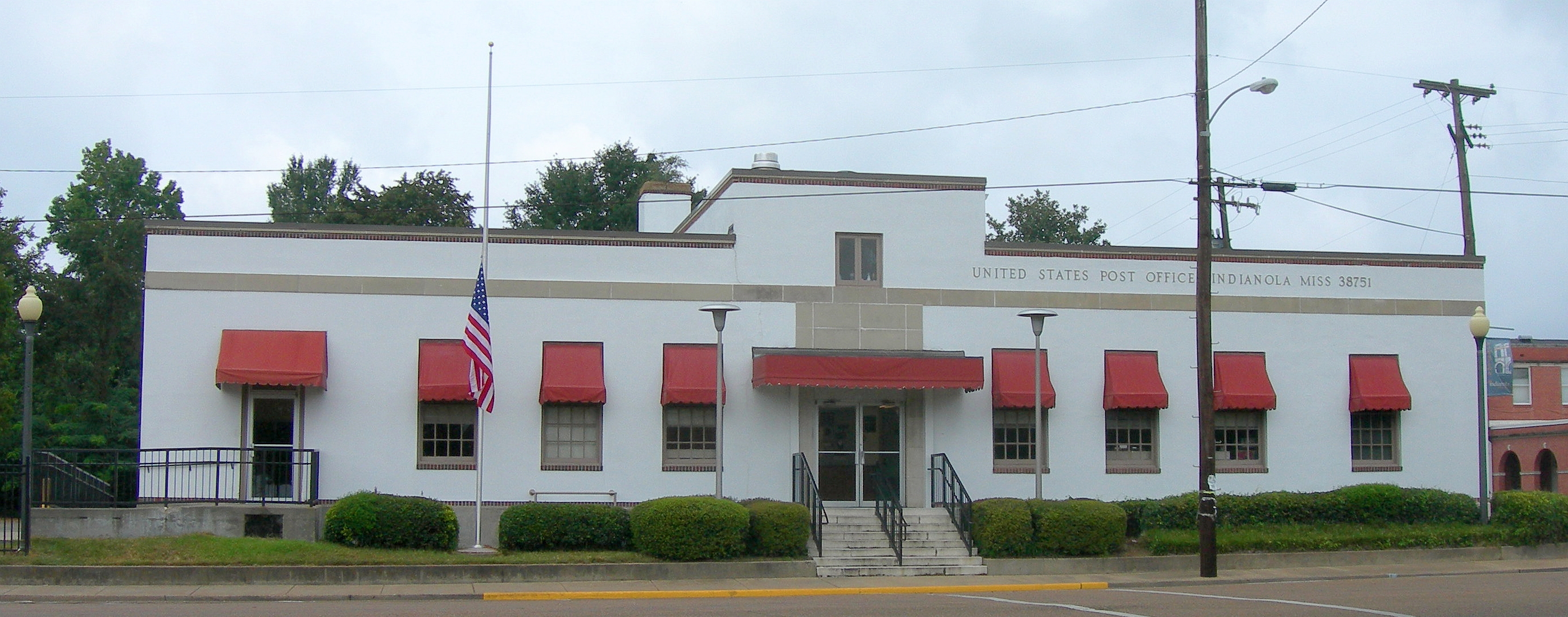 미국 우정청은 인디애놀라 우체국을 운영한다.[28] 1939년 WPA 회화 및 조각 섹션의 예술가인 Beulah Bettersworth의 작품 "델타의 백색 금"이라는 벽화가 우체국에 설치되었다. 이 벽화는 면화 수확 장면을 묘사했다. 해당 벽화는 1934년부터 1943년까지 미국 재무부의 회화 및 조각 섹션(나중에 미술 섹션으로 변경)을 통해 미국에서 제작되었다. 원래 작가인 월터 잉글리스 앤더슨은 벽화를 완성할 수 없었고, Bettersworth가 선정되었다. 이 벽화는 결국 파괴되었다. 2008년에는 의회의 법률에 따라 이 건물이 미니 콕스 우체국 건물로 명명되었다.[29]