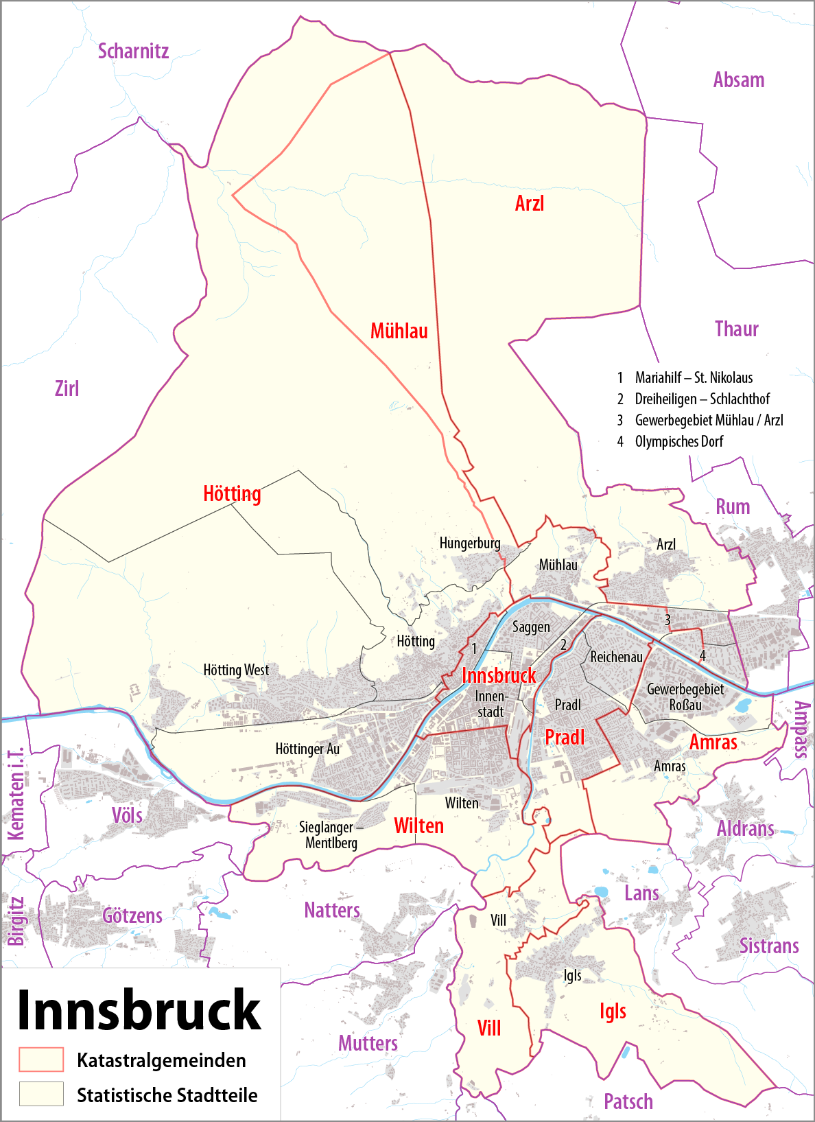 인스브루크는 과거 독립된 지방자치단체 또는 마을이었던 9개의 구(카다스트랄 정착지)로 나뉜다. 이 9개의 구는 다시 20개의 구역(카다스트랄 구역)으로 세분화된다. 통계 목적으로는 42개의 통계 단위와 178개의 번호가 매겨진 블록으로 더 세분화된다.