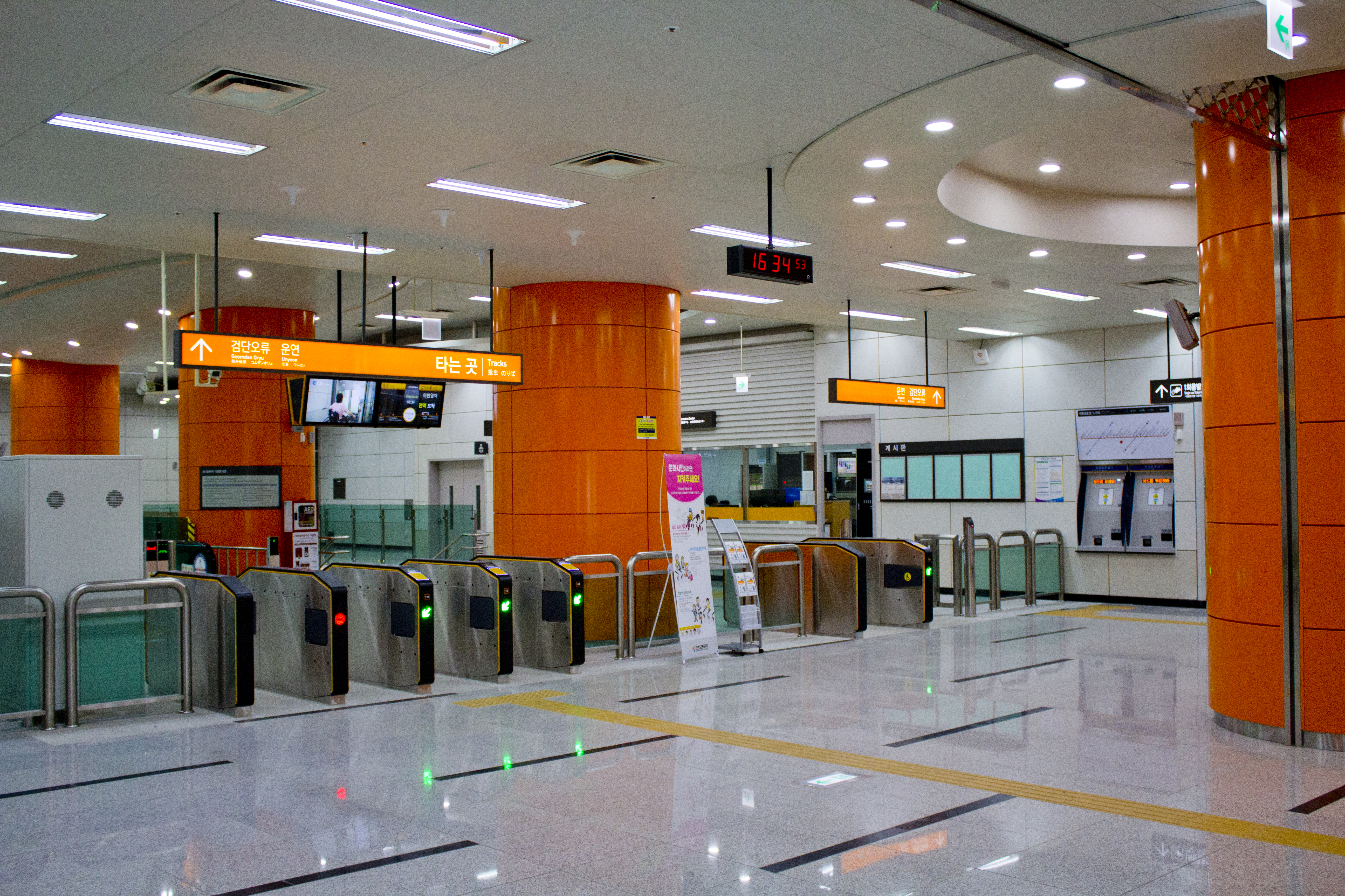 지하 2층 규모의 지하역이지만, 심도가 깊어 2개의 출입구 계단 수가 123개에 달한다. 스크린도어가 설치되어 있다.