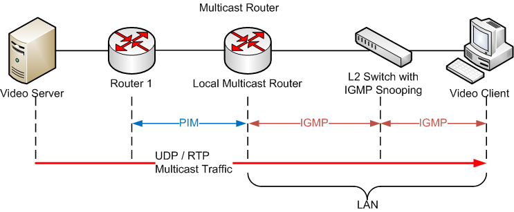 호스트는 IGMP를 사용하여 로컬 멀티캐스트 라우터에게 특정 멀티캐스트 그룹에 가입하거나 탈퇴할 것을 요청한다. 스위치는 IGMP 스누핑을 통해 IGMP 트래픽을 모니터링하여 멀티캐스트 트래픽을 효율적으로 전달한다. 프로토콜 독립 멀티캐스트(PIM)는 로컬 및 원격 멀티캐스트 라우터 간에 멀티캐스트 트래픽을 라우팅하는 데 사용된다.[1]