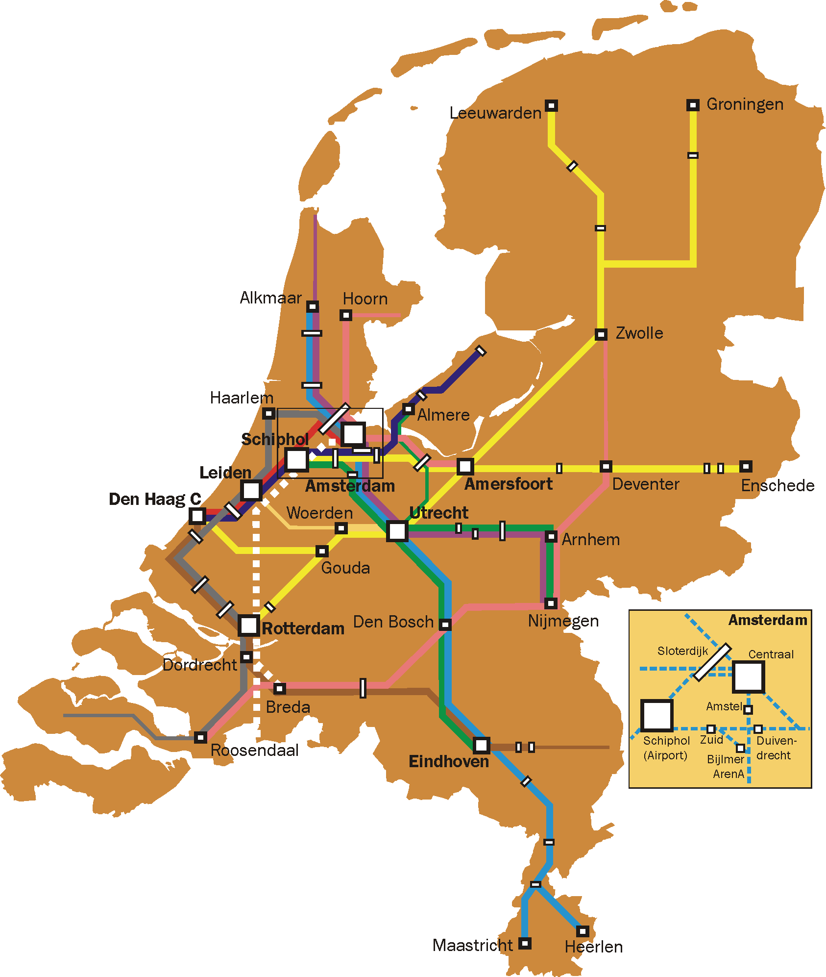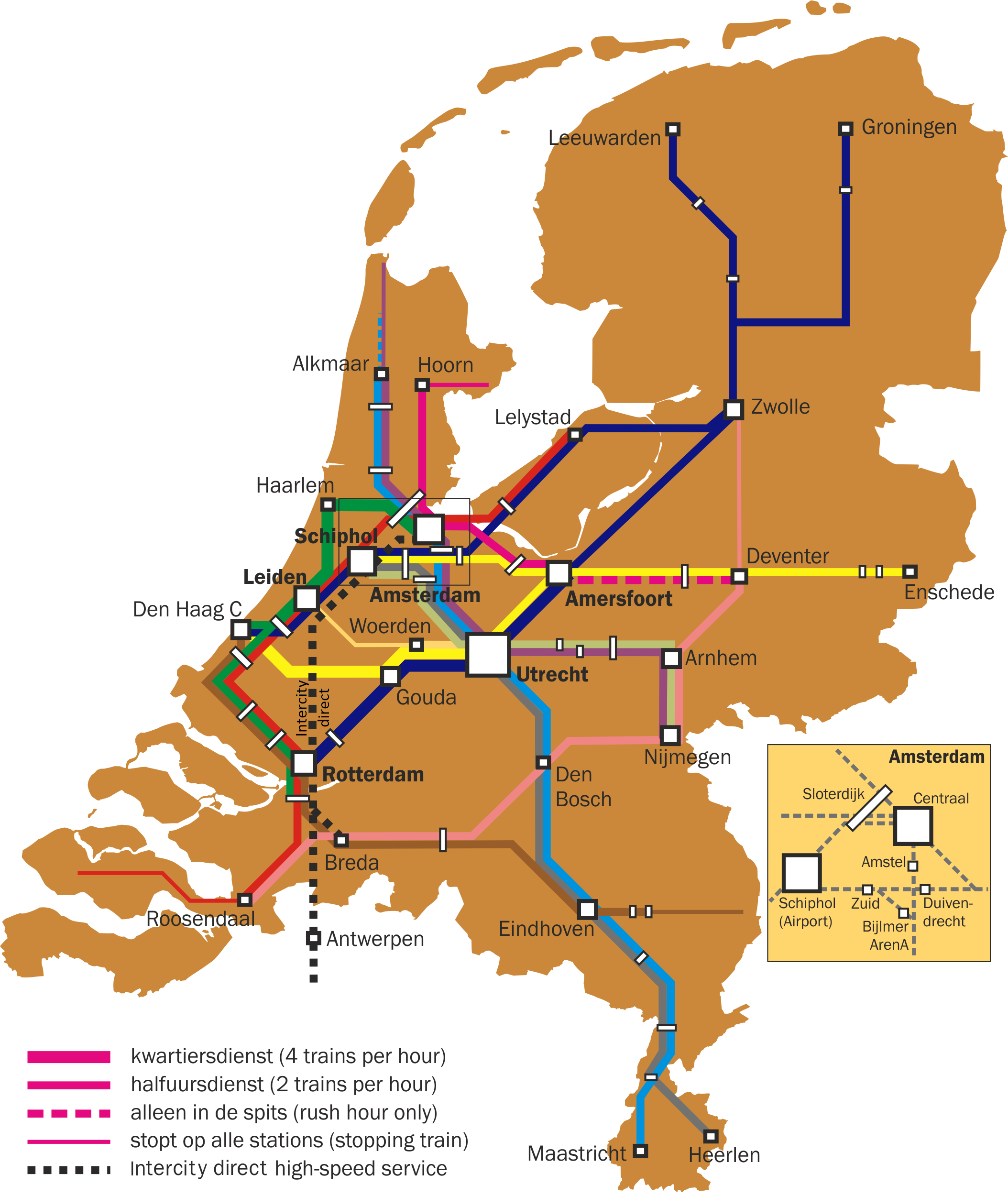 - '''네덜란드''': 인터시티 열차가 매우 흔하며, 역 간 평균 거리는 짧지만 운행 빈도는 높다. 주요 구간에서는 4편/시간으로 운행되며, VIRM, DD-AR, ICM 등 다양한 차량이 사용된다.
