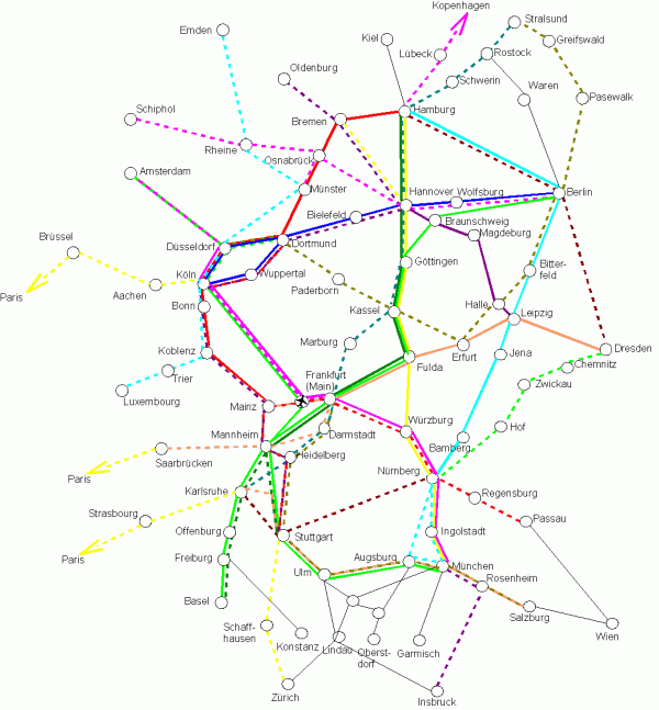 1호선 (Linie 1) | 함부르크 – 브레멘 – 뮌스터 – 도르트문트 – 에센 – 뒤스부르크 – 뒤셀도르프 – 쾰른 – 본 – 코블렌츠 – 마인츠 – 만하임 – 하이델베르크 – 슈투트가르트 – 울름 – 아우크스부르크 – 뮌헨 |