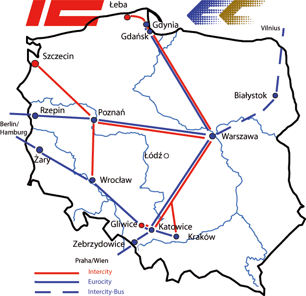 - '''폴란드''': PKP 인터시티가 인터시티 열차를 운행하며, 최고 속도는 160km이다. 2009년 IC 등급은 '''익스프레스 인터시티'''( '''EIC''' )로 변경되었고, 2014년부터 '''IC''' 열차는 고급 페사 다트(ED161)와 슈타들러 플리르³(ED160) 전동차를 사용하는 일반 고속열차로 운영되고 있다.