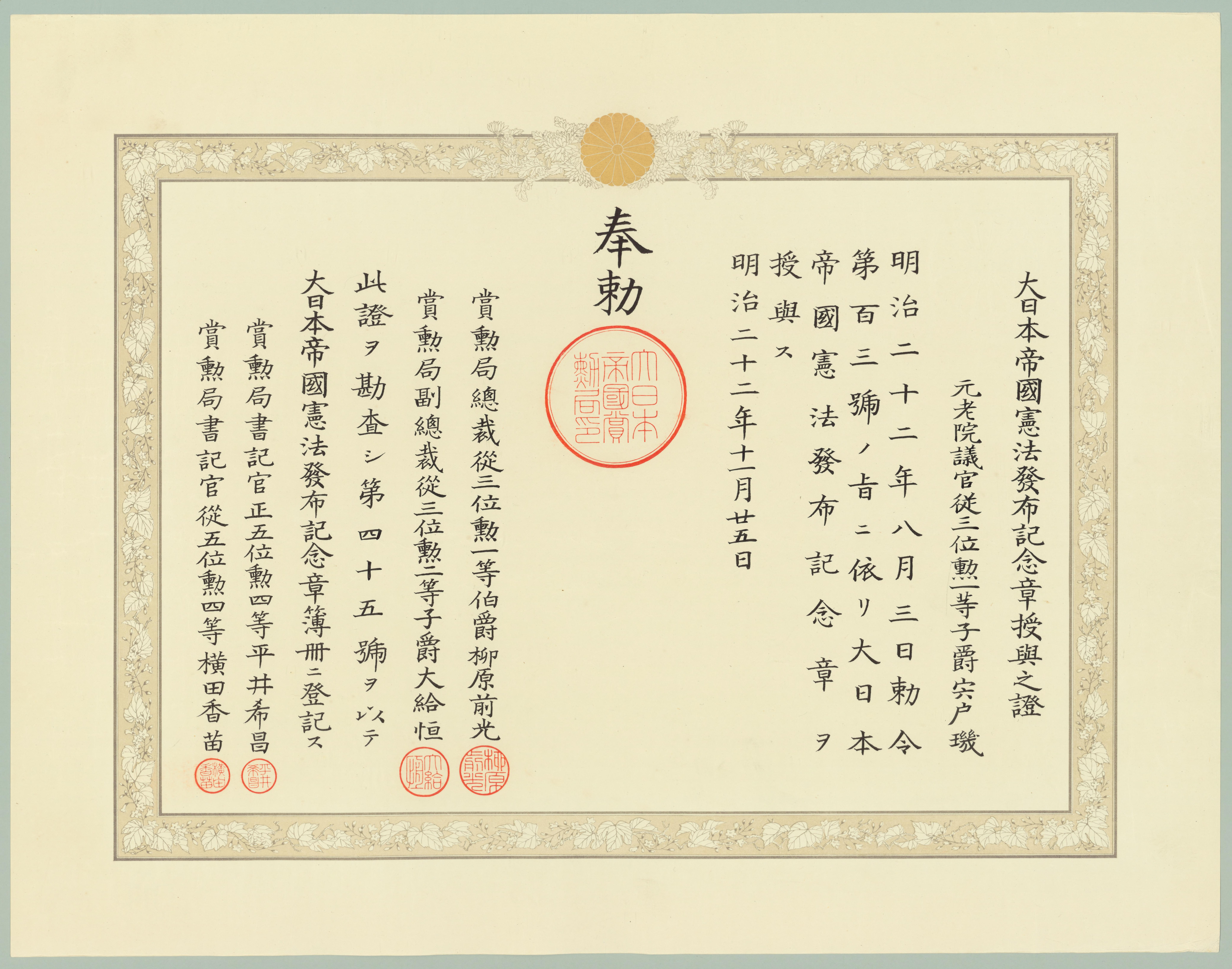 1889년 11월 25일 시시도 타마키에게 수여된 대일본제국헌법 발포 기념장 수여 증서 (국립국회도서관 소장)
