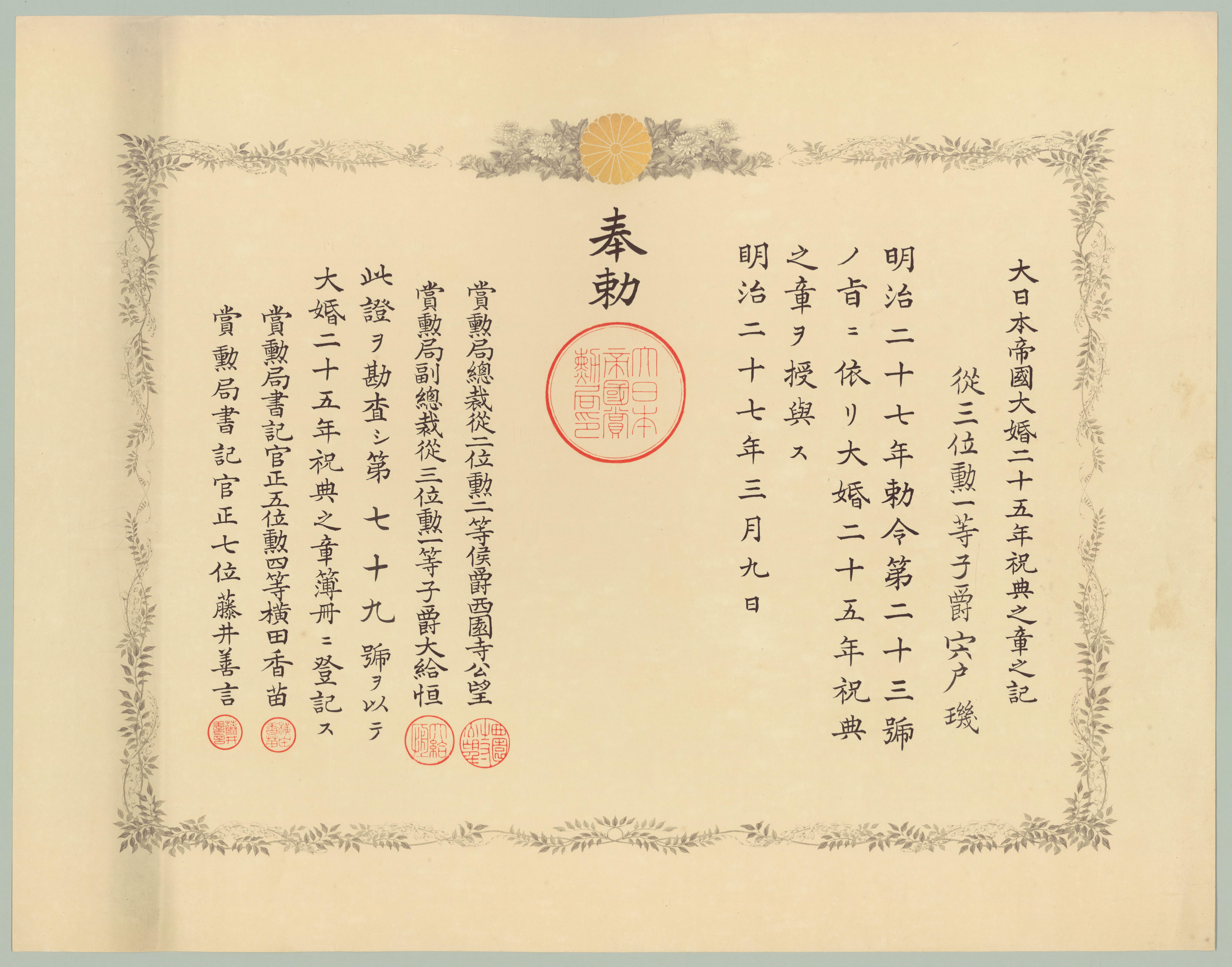 1894년 3월 9일자로 시시도 타마키에게 수여된 대혼 25주년 축전의 장의 기록 (국립 국회 도서관 소장)
