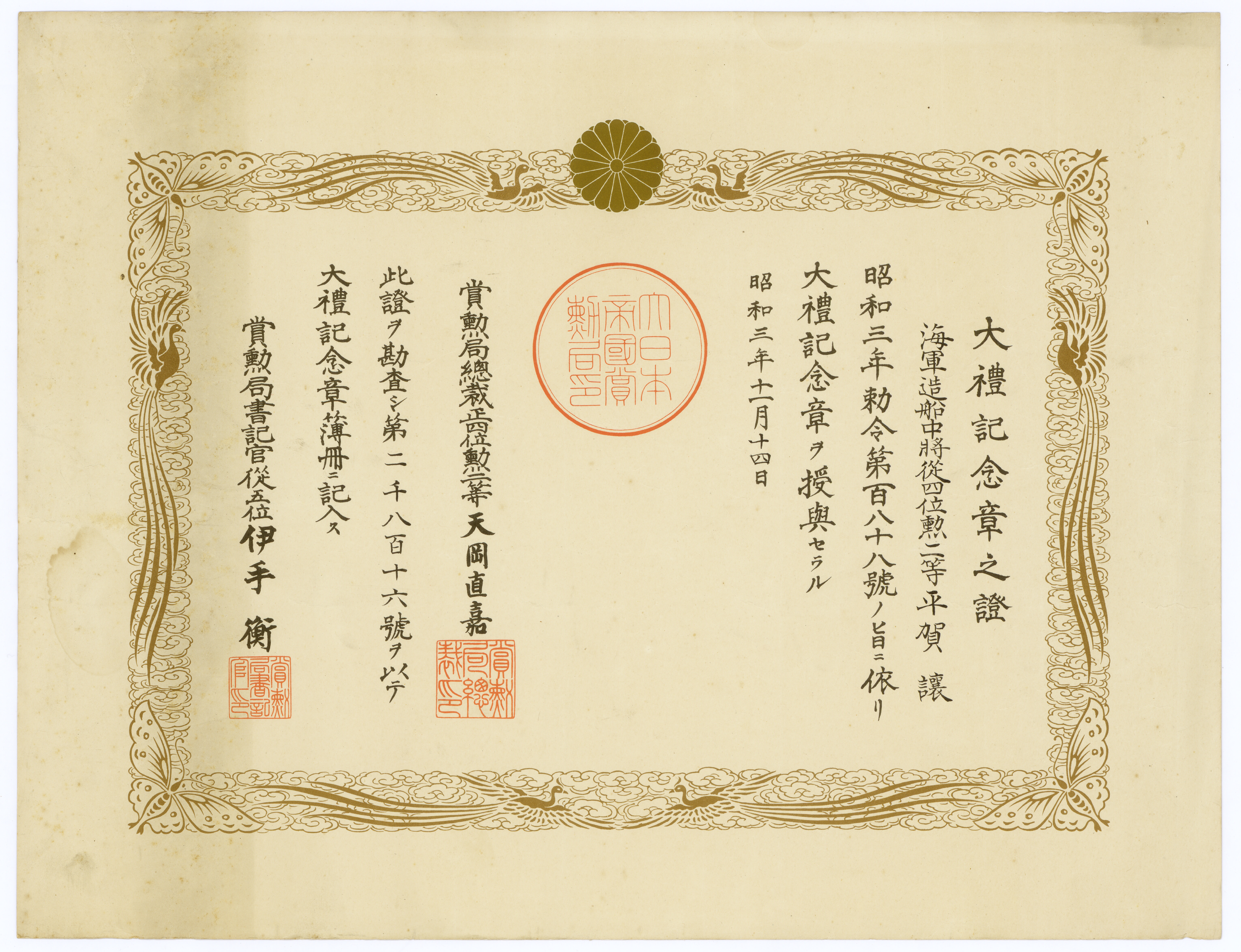 [7] 웹사이트 大礼記念章の証 昭和3年11月14日 https://iiif.dl.itc.[...] 東京大学平賀譲デジタルアーカイブ 2019-08-04
